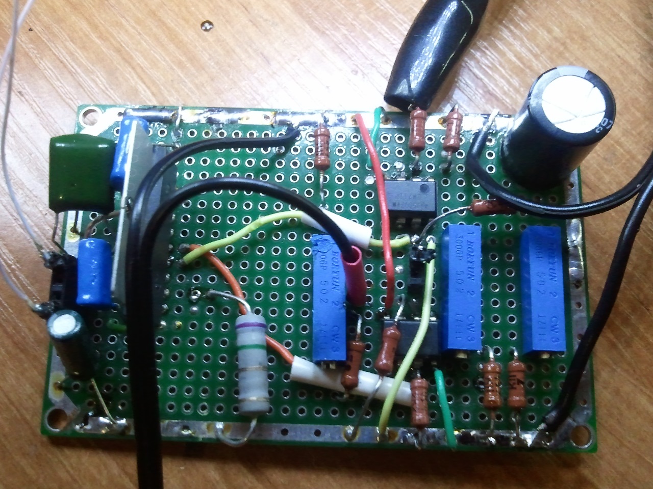 Специалисты сразу увидят, что там нет стабилитрона. Не счел нужным, поскольку схема была запитана от 12-вольтного БП "Томсон", купленного в "Электронике" за три рубля, но пири этом невероятно качественного (при изменении напряжения на входе от 100 до 250 В, напряжение на выходе менялось на 50 МВ.)