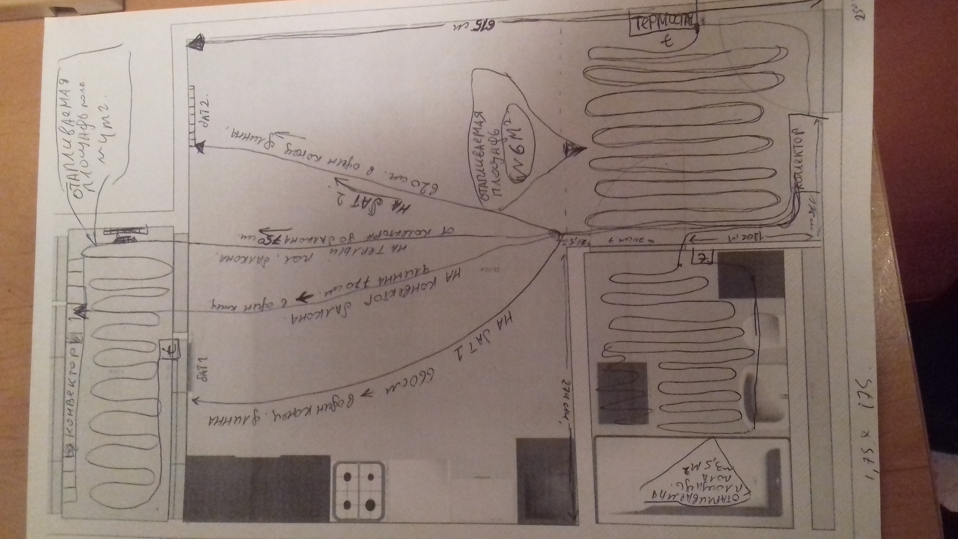 - в 3 контура, с выносными термостатами (прихожая, ванна и балкон, общая отапливаемая площадь 13,5м2)