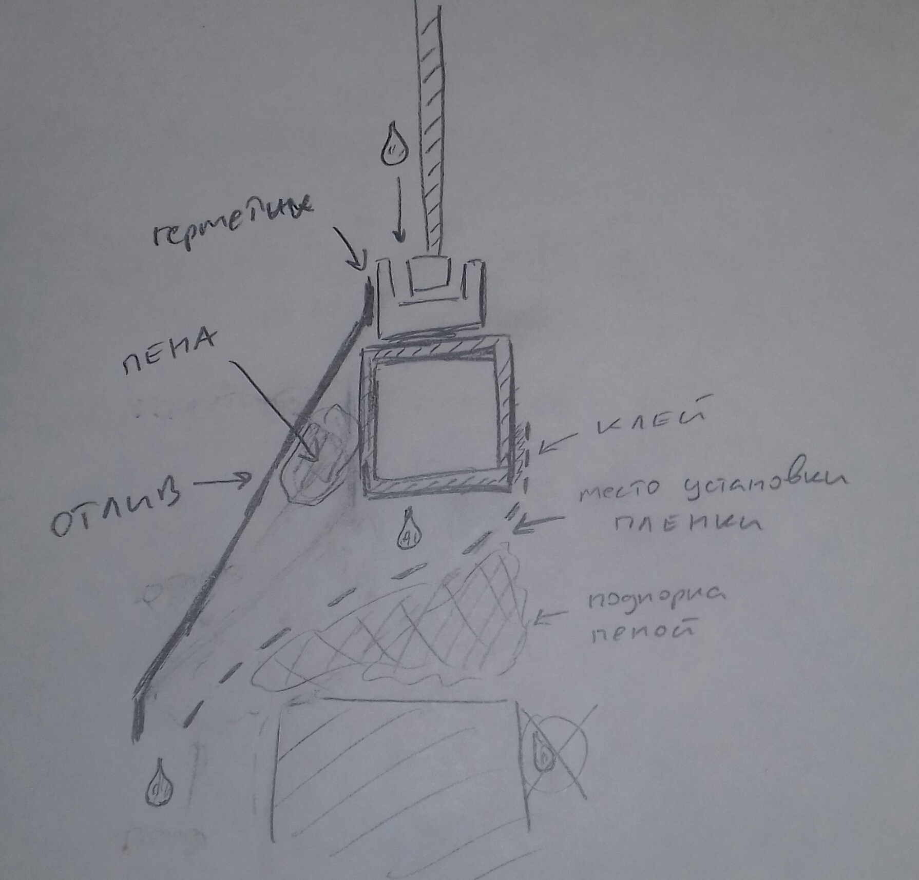 я бы туда не пленка использовал, а оцинковку согнутую по чертежу. прямо под низ этого отлива.
