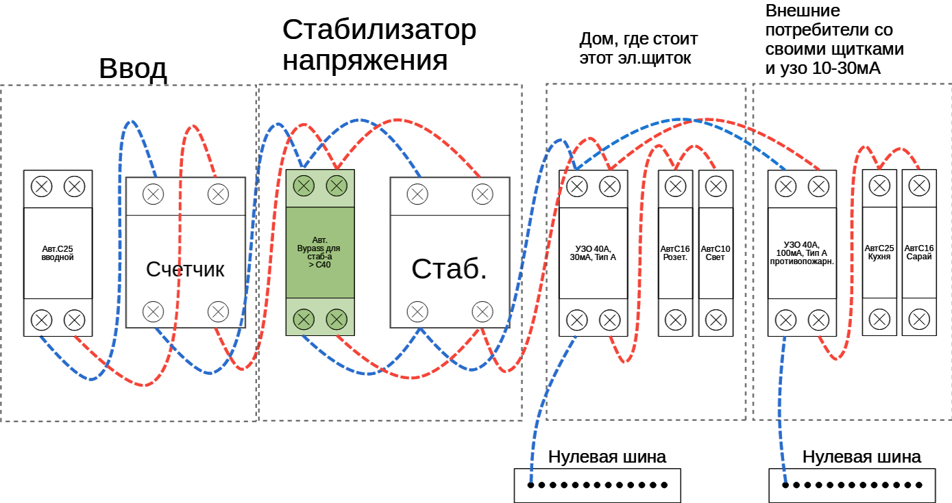 Ниже на схеме электрощитка он выделен зеленым. Недостатком вижу только гипотетически разную скорость замыкания/размыкания полюсов автомата-переключателя. Т.е. в момент включения этого автомата, например, фазный полюс "замкнется" быстрее нулевого. Не поплохеет ли стабилизатору? Покритикуйте пожалуйста.