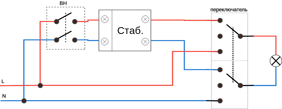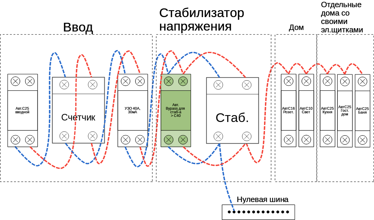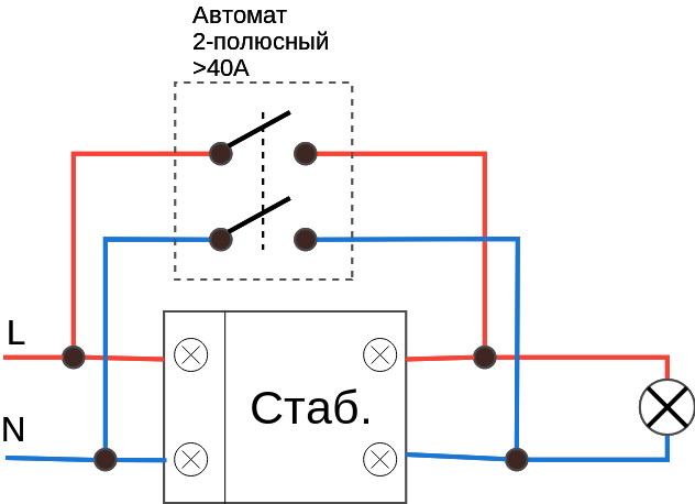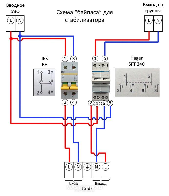 т.к. на даче часто пониженное напряжение, то на кухне используем настольный стабилизатор на 8кВт, через который подключено 2 холодильника и микроволновка. Пришла мысль перенести его в основной дом. Но т.к. стабилизаторы иногда ломаются (как и любая другая техника), появилось желание сделать внешний байпас для него. Чтобы на случай его поломки можно было щелкнуть реле, переключив провода в обход стабилизатора, и снять его, не залезая в эл.щиток.
