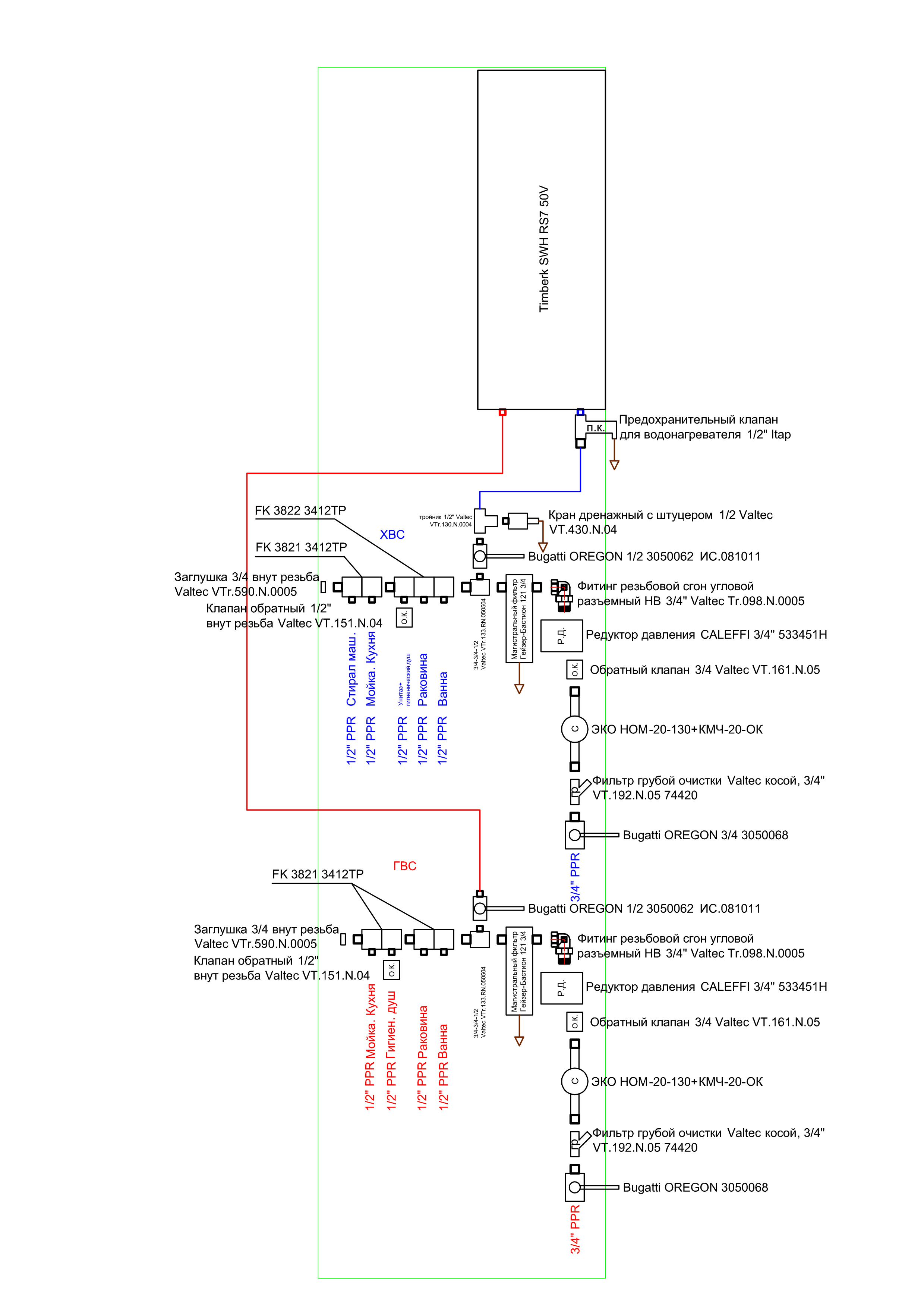 Здравствуйте, форумчане! Помогите, пожалуйста! На схеме представлен проект коллекторной разводки в квартире многоэтажной новостройки. Вопросы: 1)Можно ли запитать от одного отвода коллектора гигиенический душ и унитаз по тройниковой (последовательной) схеме? 2)Слышал, что в квартирах не пломбируют счетчики 3/4", дом во Фрунзенском районе СПБ. Так ли это? 3)Соответственно если пломбируют только 1/2", то все что до коллектора будет 1/2" так?