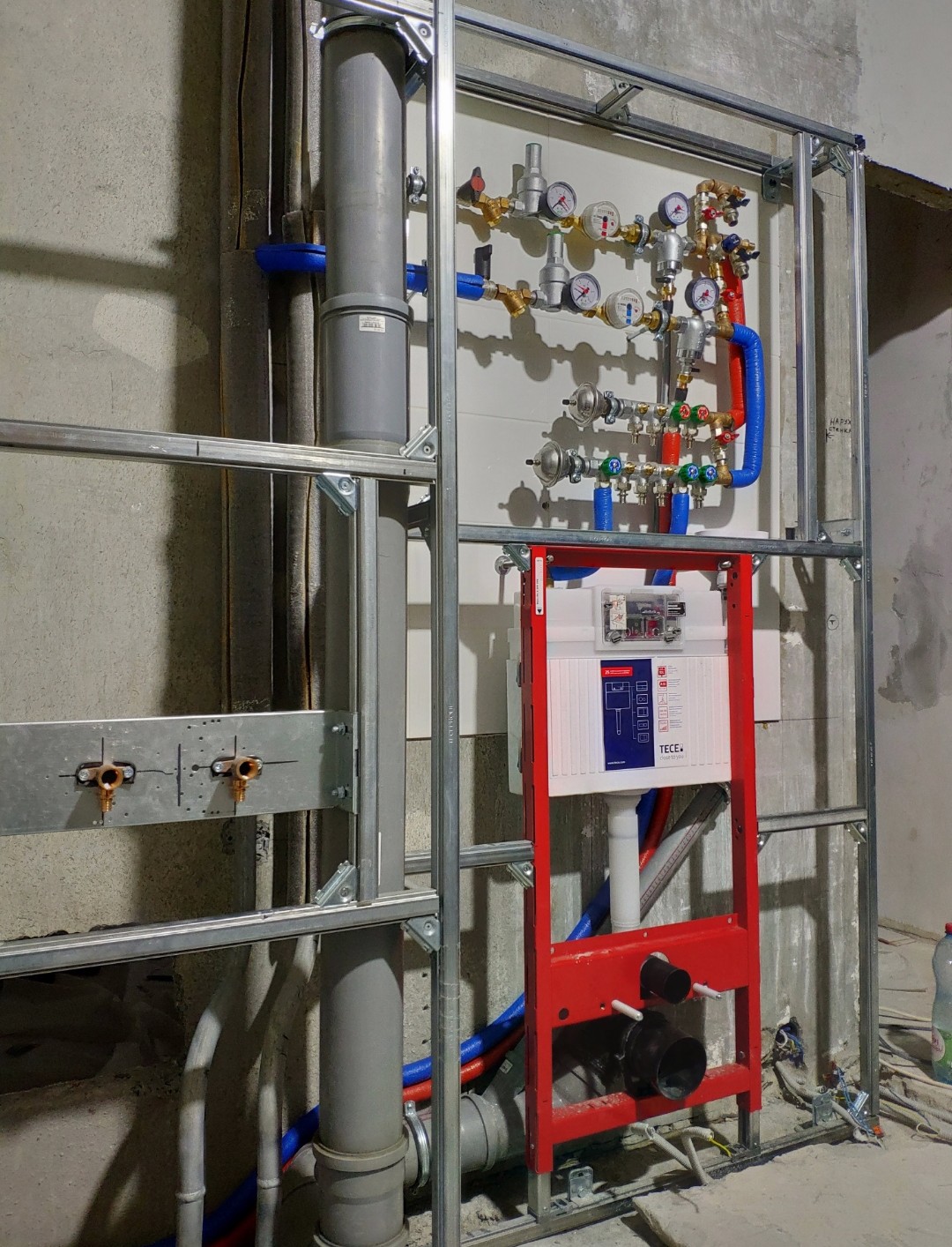 На фото выше всё просто роскошно (по количеству места за инсталляциями), а вот пластина на которой установлены розетки для раковины (?) сделана не правильно - нужно было обязательно два отгиба сделать по длинной стороне, так вообще никакой жескости, только лишний расход материала.