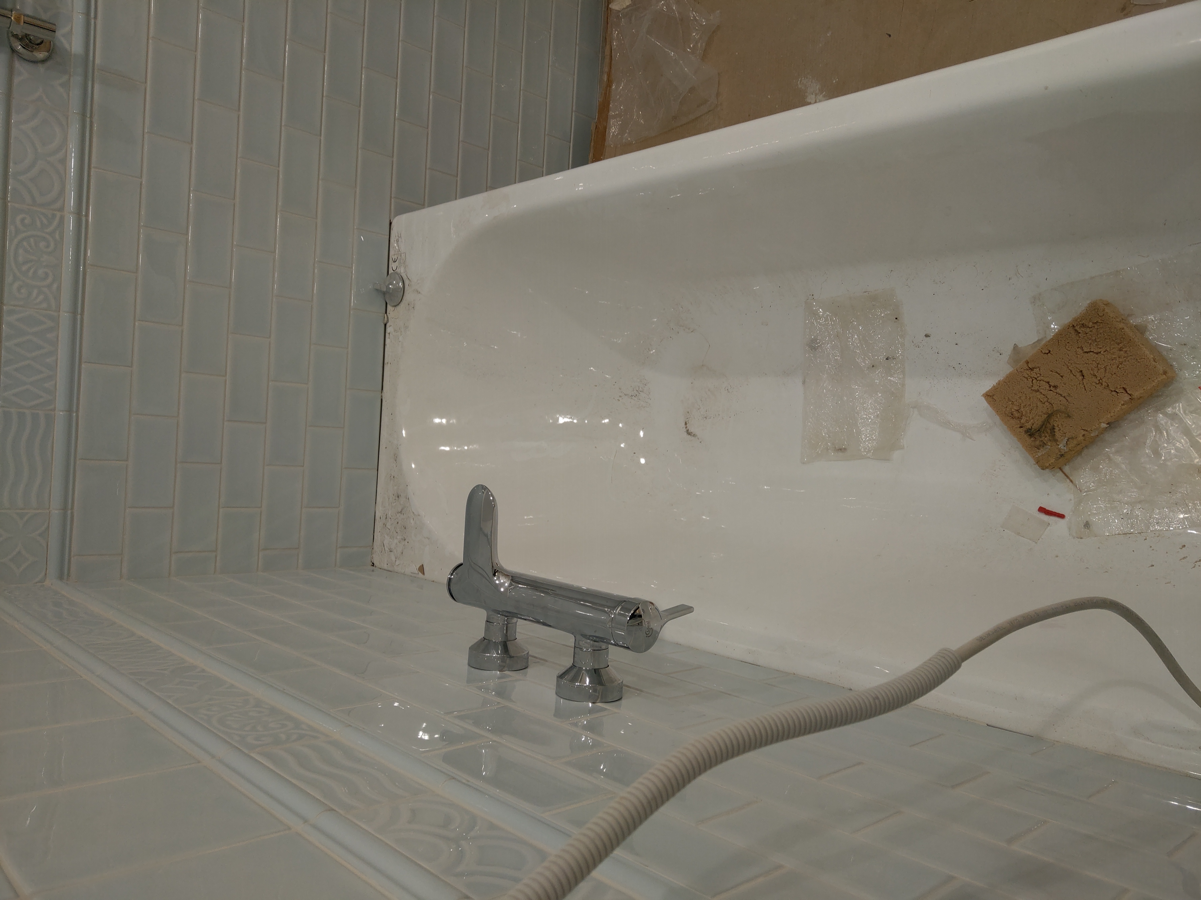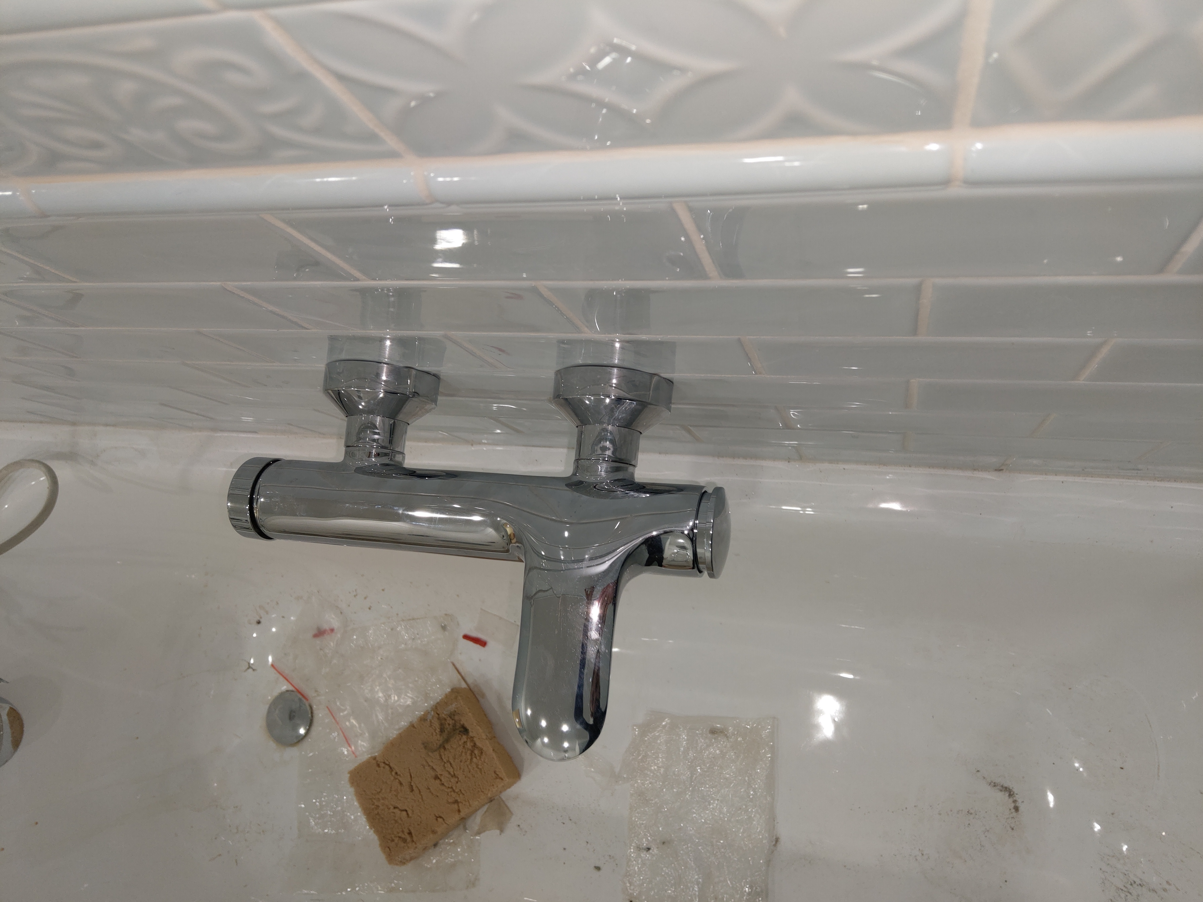 Запланировали смеситель на боковую сторону ванны, посередине, в начале ремонта. Боялись, что может из-за не слишком длинного излива будет струя в борт ванны бить. Сейчас выбрали смеситель, поставили, так излив сильно торчит в сторону центра ванной, и будет мешаться при эксплуатации - цепляться, боюсь, будем за него.