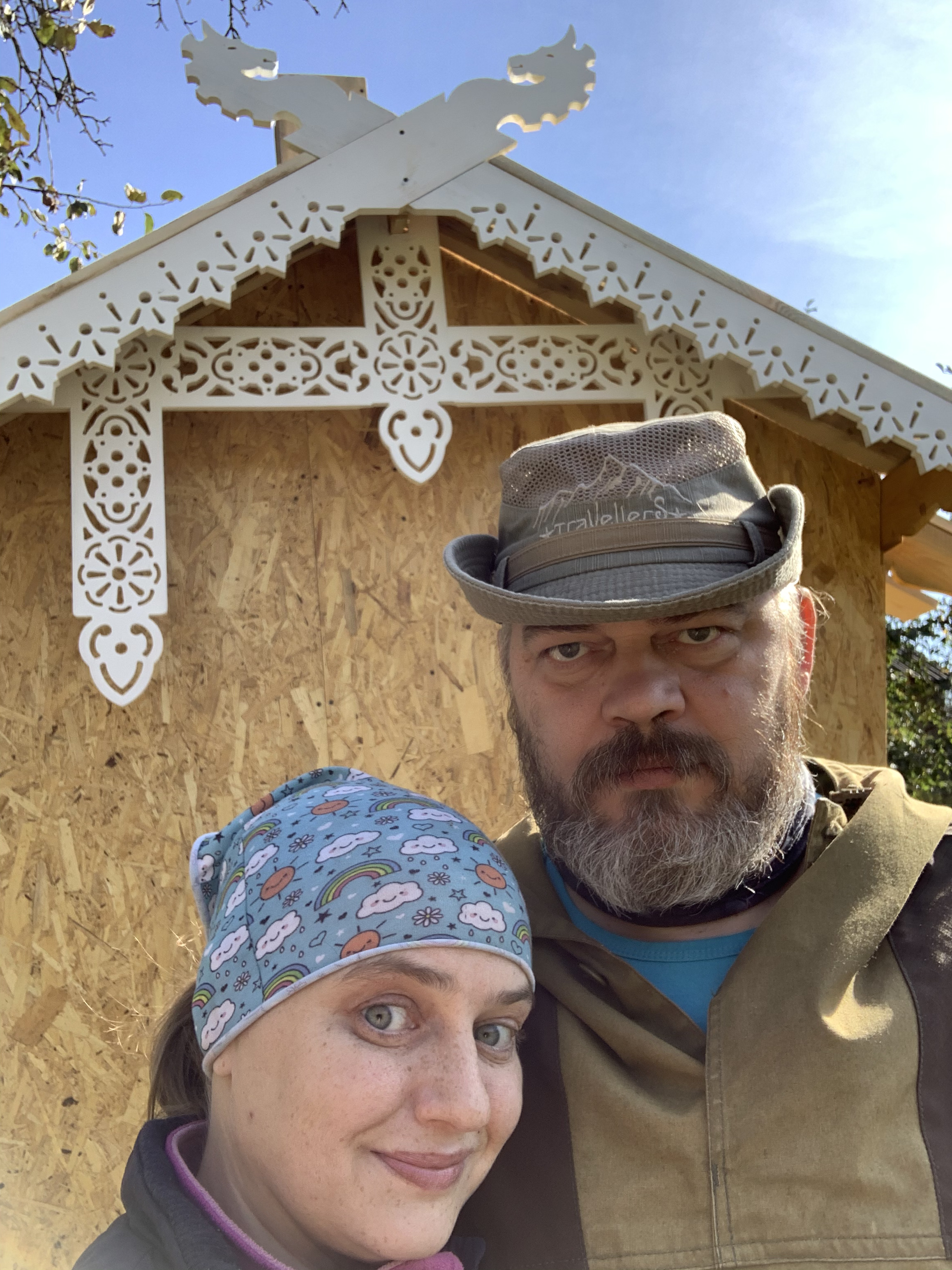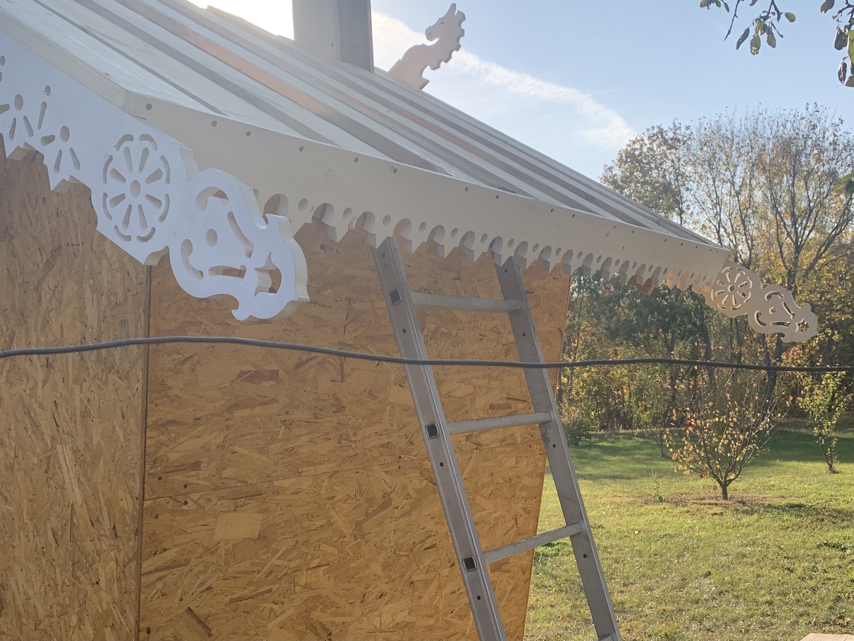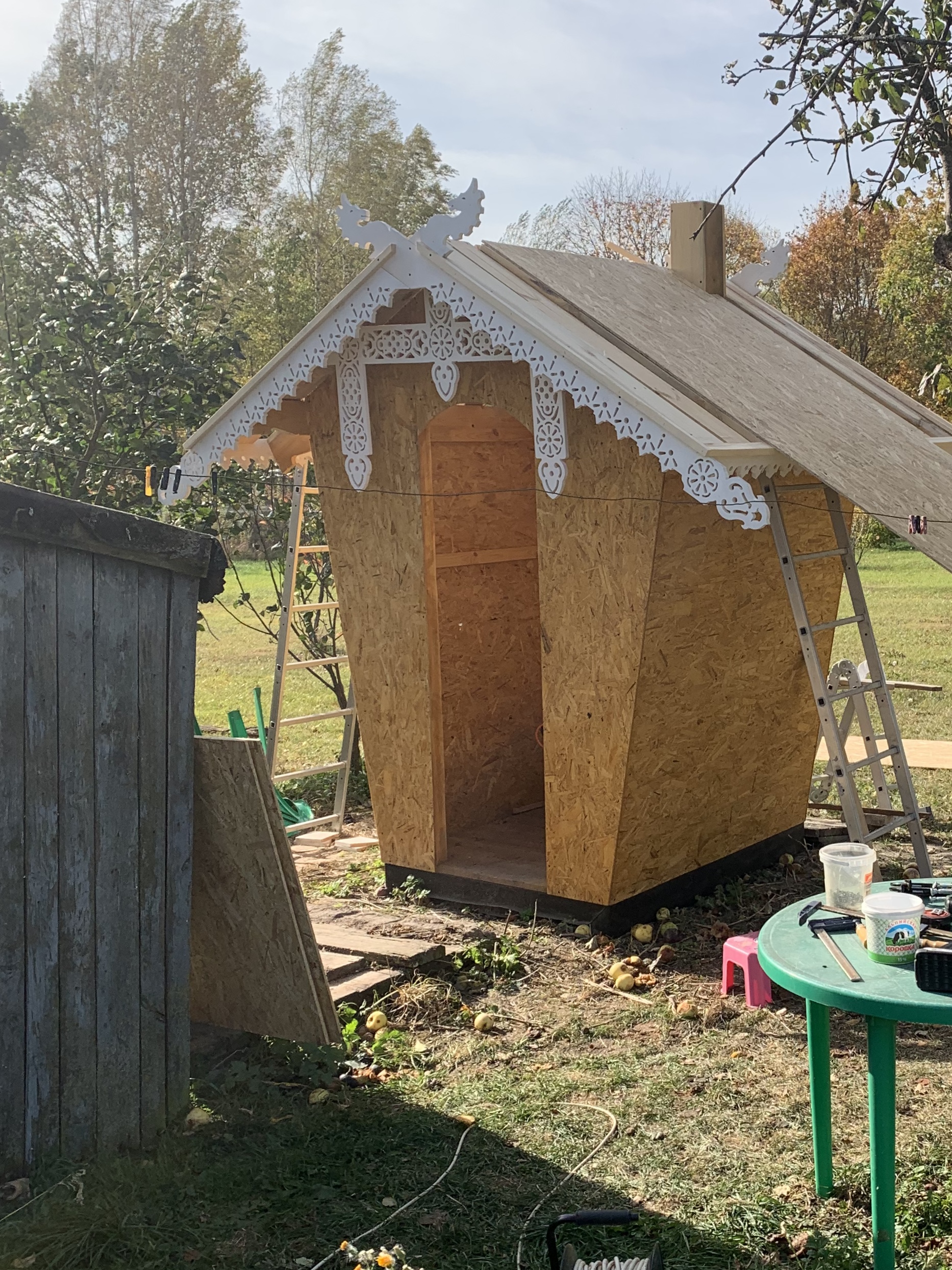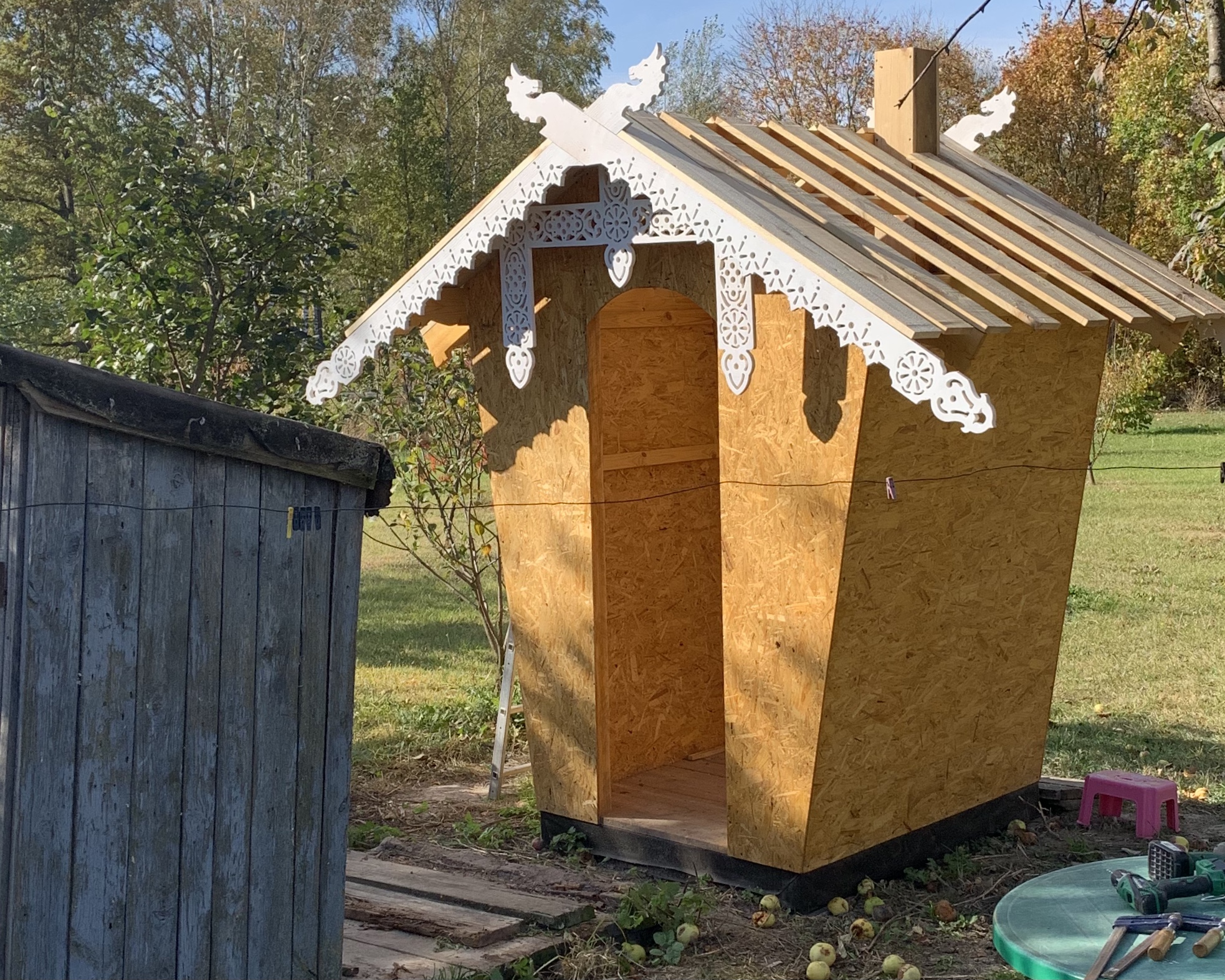 Казалось бы, все. Ходи себе, наслаждайся дефекацией сидя на унитазе, как все современное человечество, забыв про позу орла, вдыхай запахи сосны, воска и льняного масла, как человечество древнее… Ан нет. Кто мы такие, чтобы лезть в художественный замысел архитектора? Очень сильно не хочется, но нужно возвращаться к украшулькам-украшательствам нашего пердонария. Пилим – фрезеруем – красим шпили (вилли) и коньковую доску.