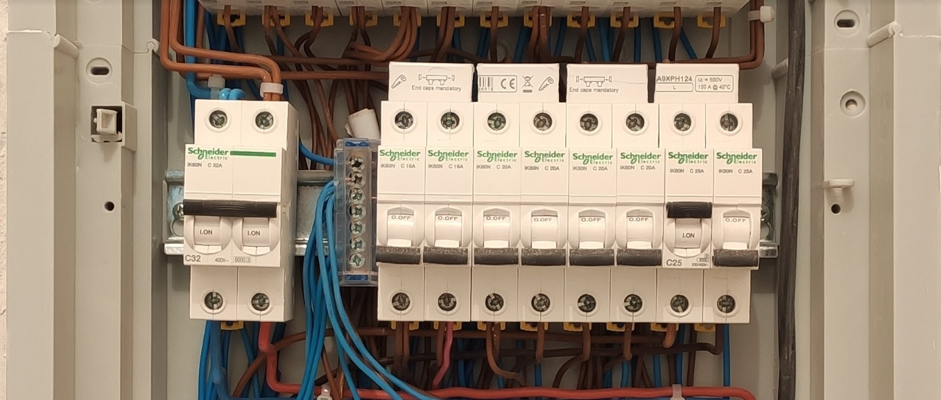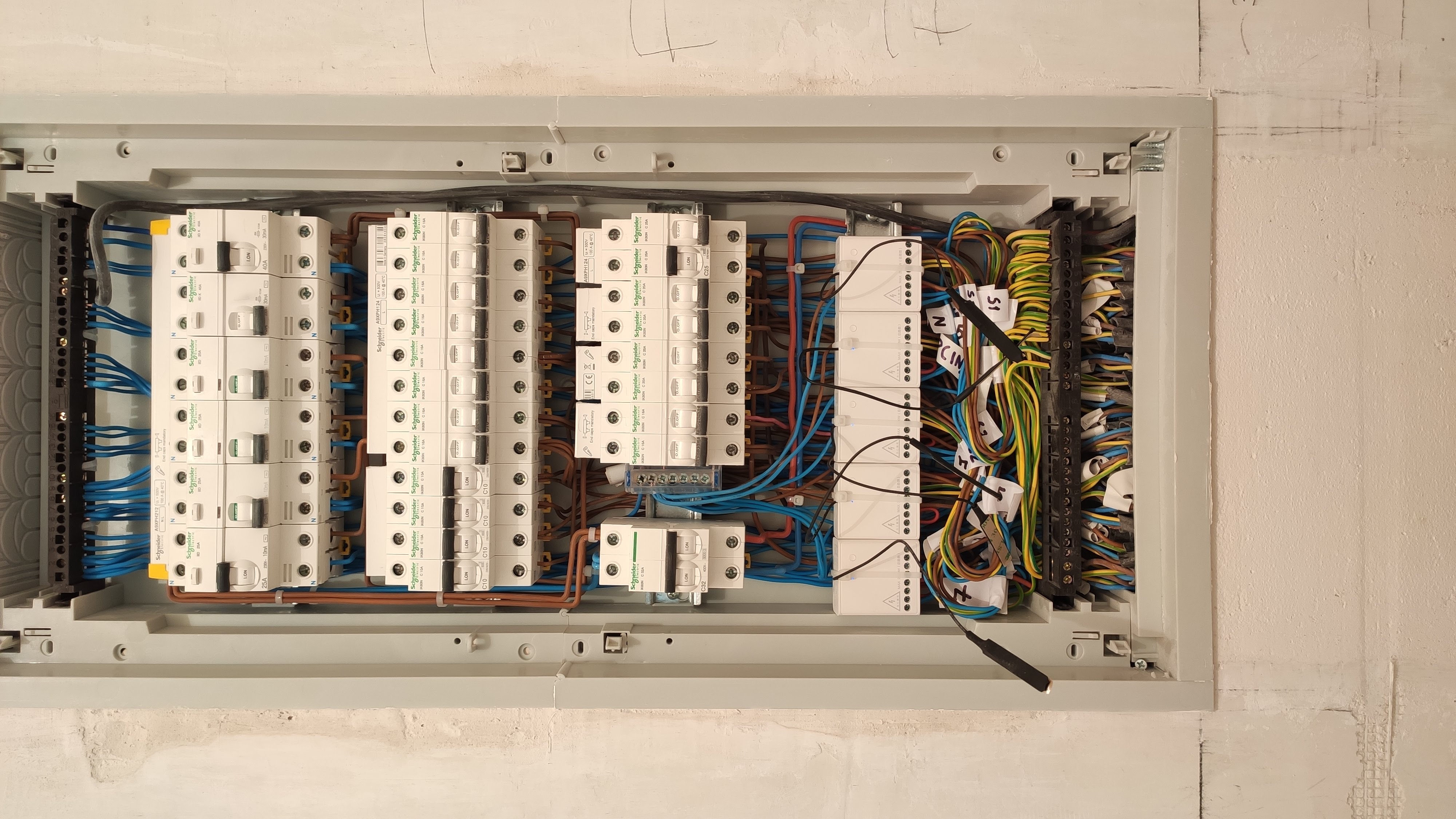 Вот ещё и электрощит для контекста. Речи идёт о последних двух автоматов на 25 из предпосленииво ряда(не уверен если видно на фото). Последний ряд можно игнорировать, сейчяс этих модулей там нет.