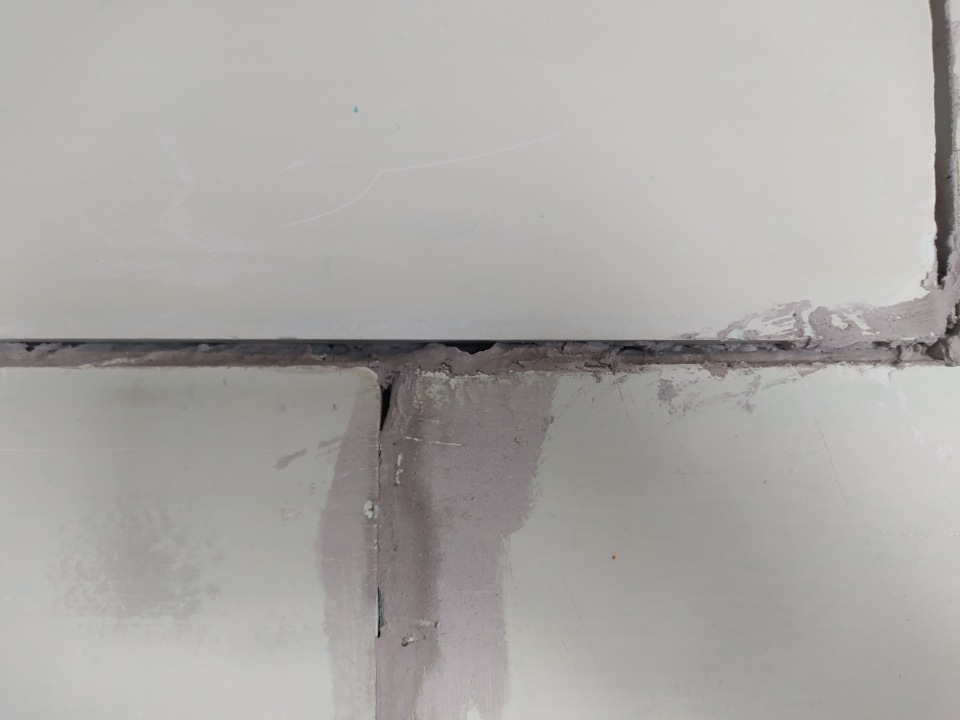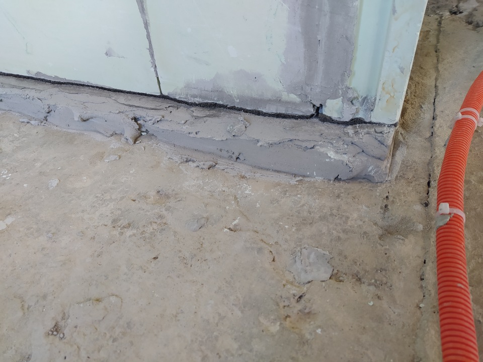 Короче горе мастера выровняли основания гипсовой штукатуркой. Ее нанесли прям на скотч который мы с женой нанесли чтобы понять какие размеры будут у будущего с\у. Сколько сохла штукатурка не понятно. Но по ощущениям она в жирном слое еще сырая. Внизу проложили ленту для стяжек, хотя я просил сделать на пробковой\полимерной. Премыкание с бетонной стеной тоже не проложили. В итоге примыкание со стеной треснуло. Как будет стоять дальше не понятно. После сделали паршивую гидроизоляцию не по технологии. Думал отделаться малой кровью - сделать норм гидру, но начал промерять размеры и увидел трещины - опечалился.