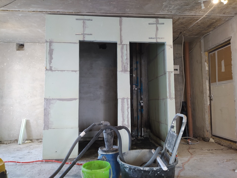 Необходимо произвести выравнивание основания плиты пескобетоном. На высохший слой и стены\потолок приклеить специальную ленту для шумоизоляции. Далее построить перегородки из влагостойкой полнотелой пазогребневой плиты стены санузла и туалета по данным размерам. Стену в ванной (межквартирую) необходимо отштукатурить цементными материалами. 2 дверных проема. В понедельник снесут бракодельные стены. И можно среди недели приступать к работе.