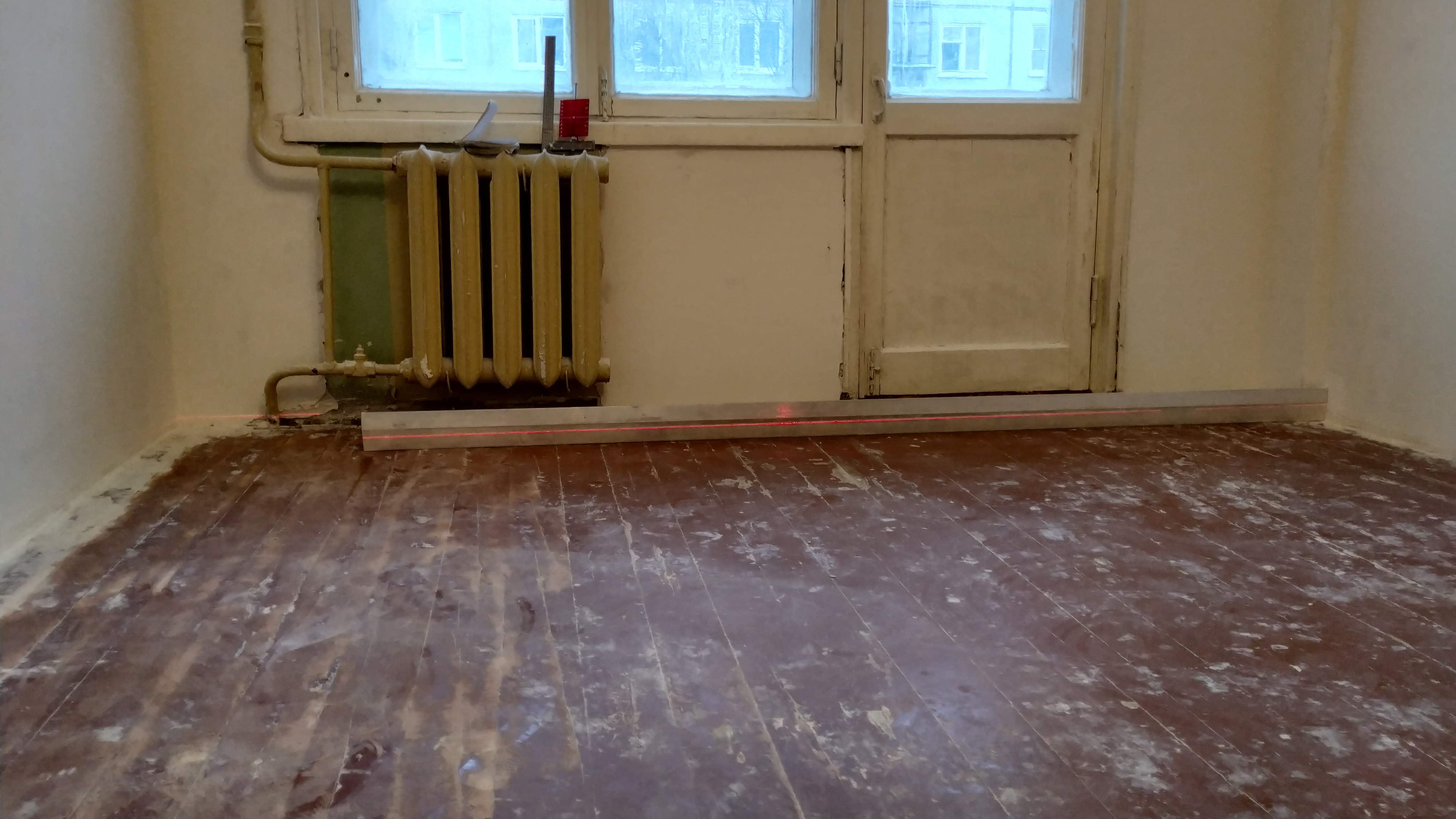 Доброго времени суток уважаемые мастера! Делаю ремонт в панельной пятиэтажке- брежневке 1971г.в., необходимо выровнять полы в двух комнатах и кухне, померял лазерным уровнем, перепад в комнате длиной 5.6 м, один угол выше на 2 см, так же в центре комнаты наблюдается провал в 1 см. В кухне вообще полный ахтунг , перепад на 2.5 м составляет аж 2 см (. Доски шпунт походу 30 мм, на вид не гнилые, малость поскрипывали, протянул в кухне и коридоре по лагам саморезами, скрипы пропали. Собираюсь подготовить пол под линолеум, с возможностью в будущем замены на ламинат. Изучение вопроса привели к следующим выводам: ДВП – дёшего и сердито, но не решает проблему кривизны, остановился на вариантах фанеры или ОСП, смотрел на ютубе ролики по выравниванию методом установки по периметру через каждые 20 см, квадратов 10х10 см различной толщины в уровень, с последующим настилом на них листов фанеры в один слой, если толстая и в 2 если по тоньше, 8-10 мм. Скажите, это единственный вариант выравнивания без демонтажа полов?! Фото пола прикладываю.