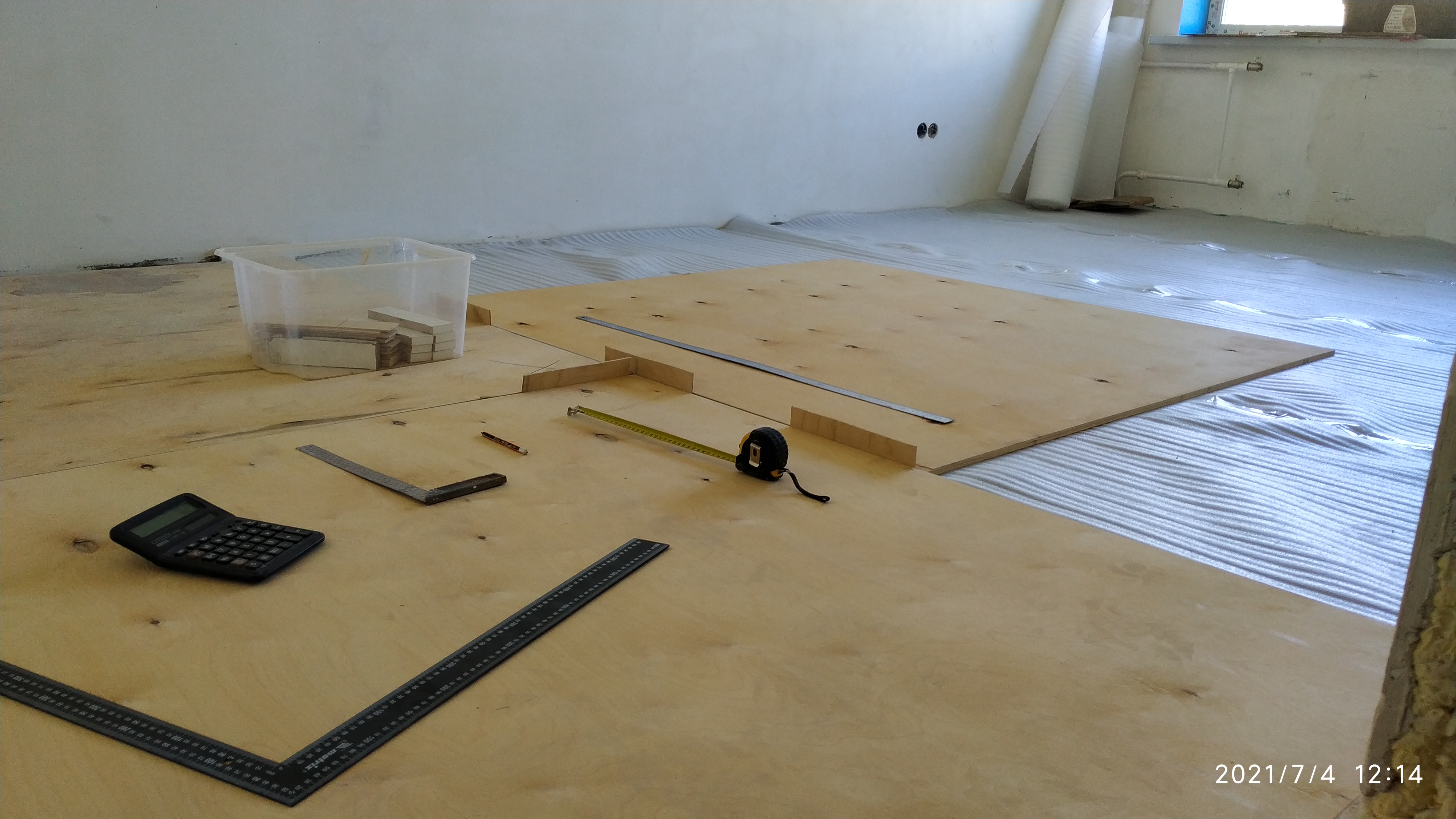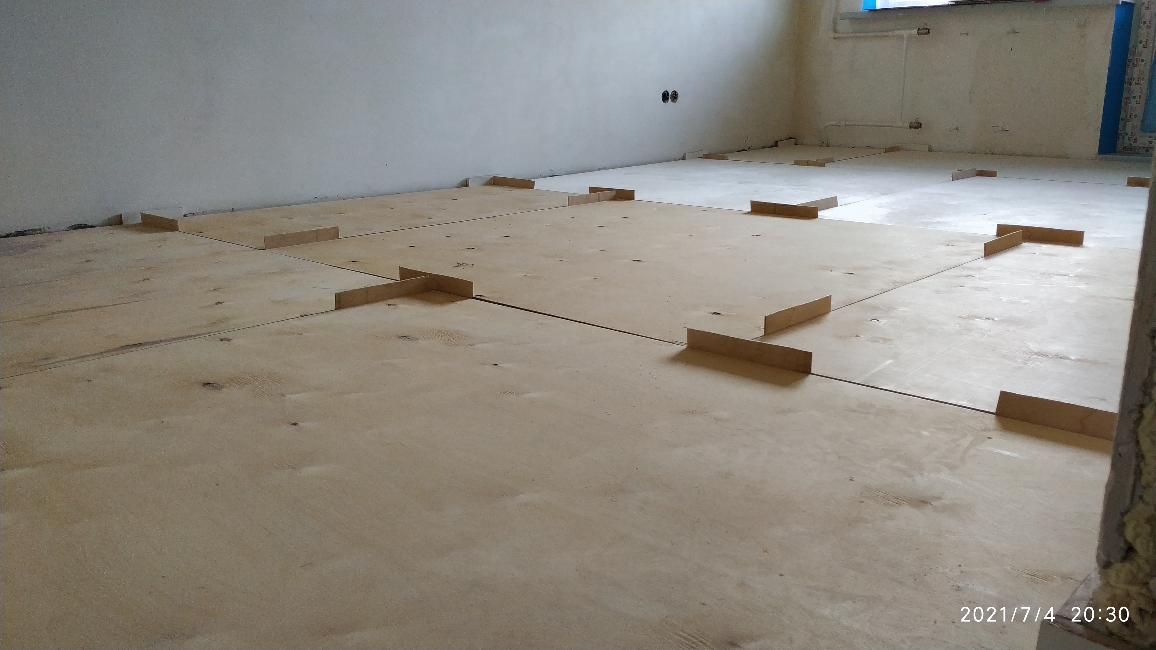 Выровнял пол клеем в двух комнатах, затем на подложку 2 мм уложил фанеру в разбежку, зазор между стеной и фанерой делал 18 мм (напилил лист дсп), зазор между стыками листов 3 мм (удобно контролировать напиленными кусками фанеры), дальше буду прикручивать, замазывать стыки пва клеем с опилками,а зазор между стеной и фанерой пенить.