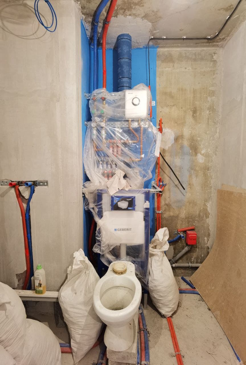На данный момент уже поставлены стены, стяжка и разведена сантехника. Ниже представлено фото до выполнения стяжки и до оштукатуривания штроб.
