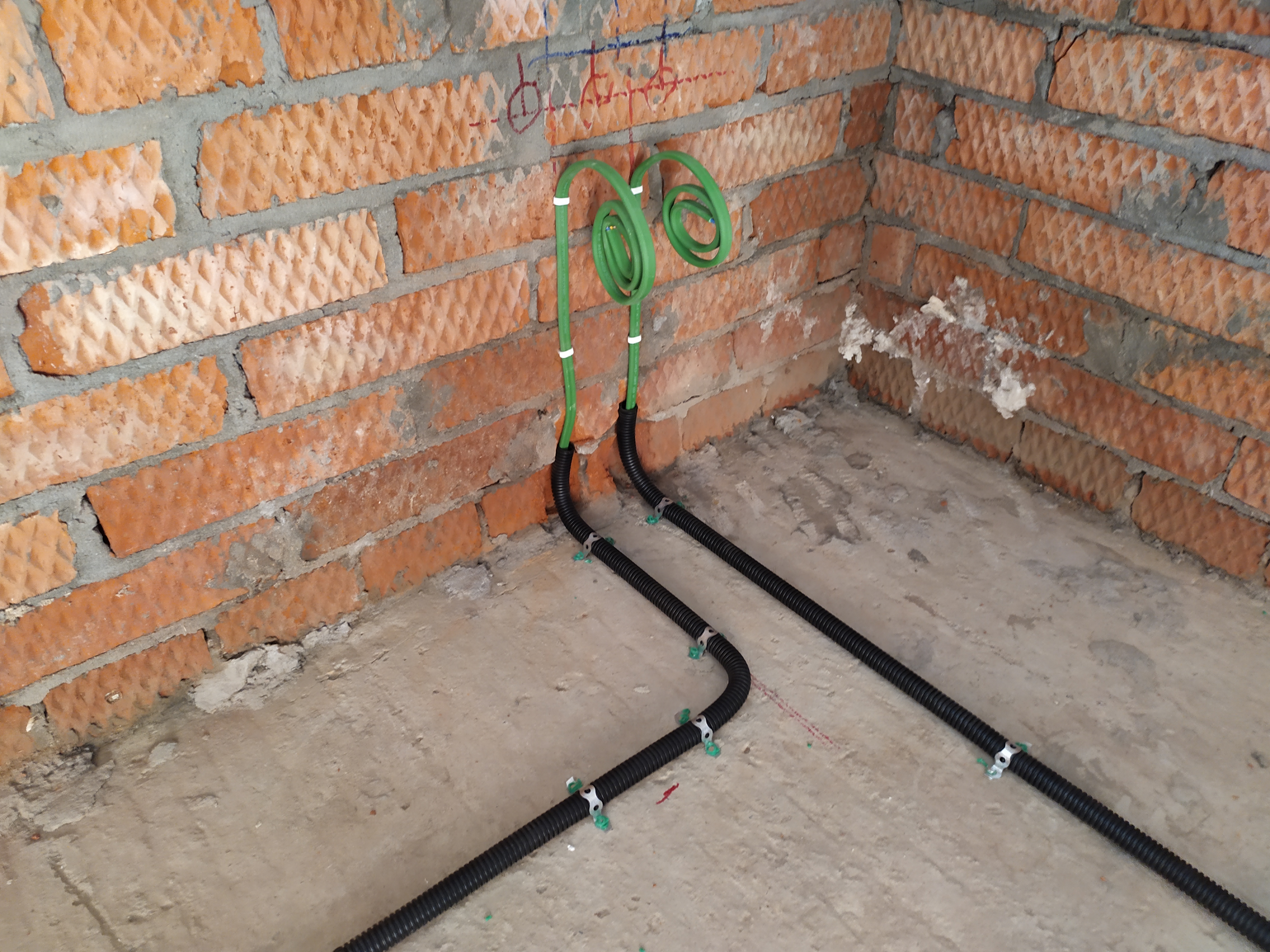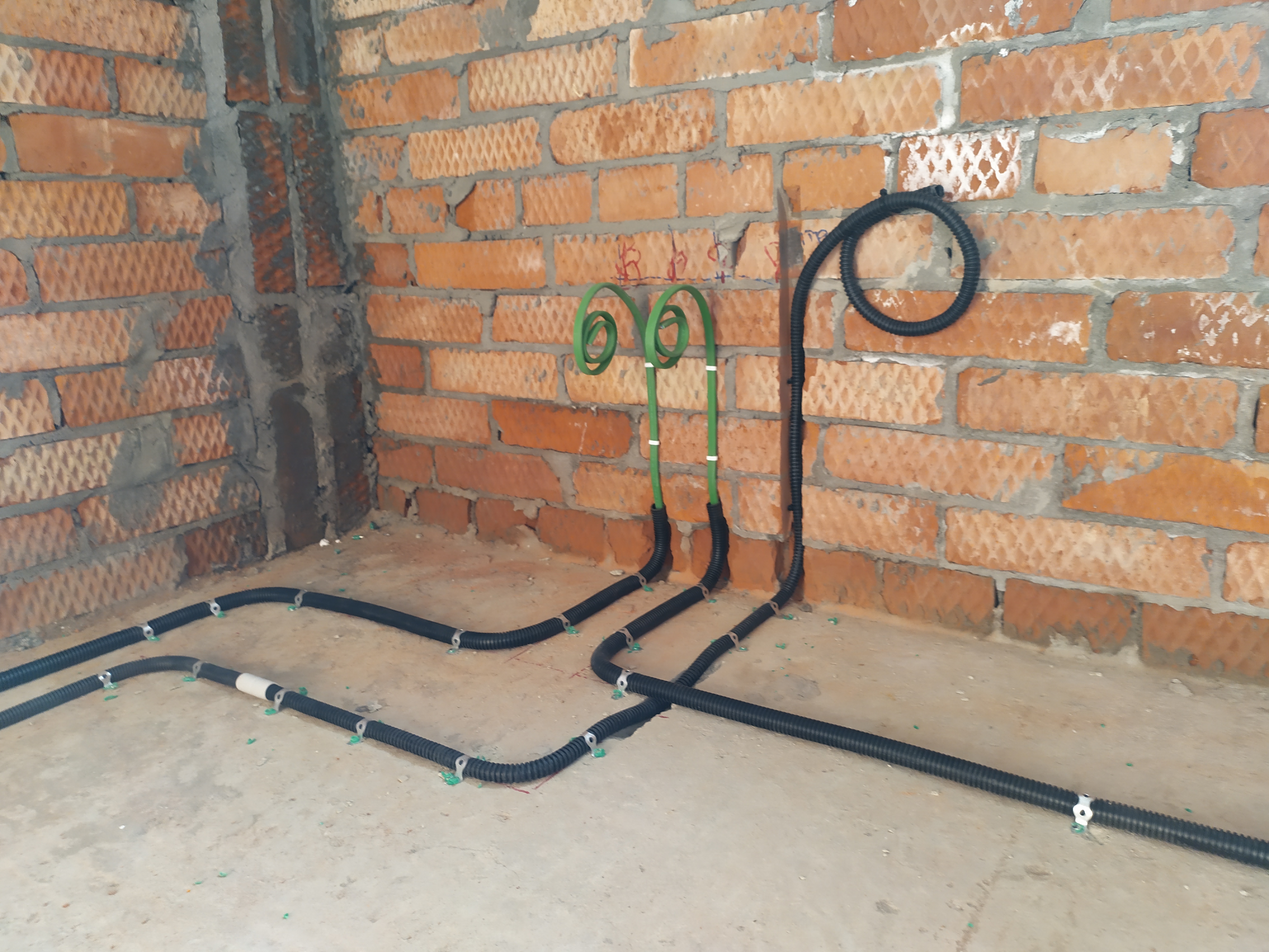 В стяжке - кабель в пластиковой гофре, 1 гофра - 1 кабель. Гофра типа такой - труба гофрированная ПВХ ЭРА ЭКО D16мм с зондом легкая серая.