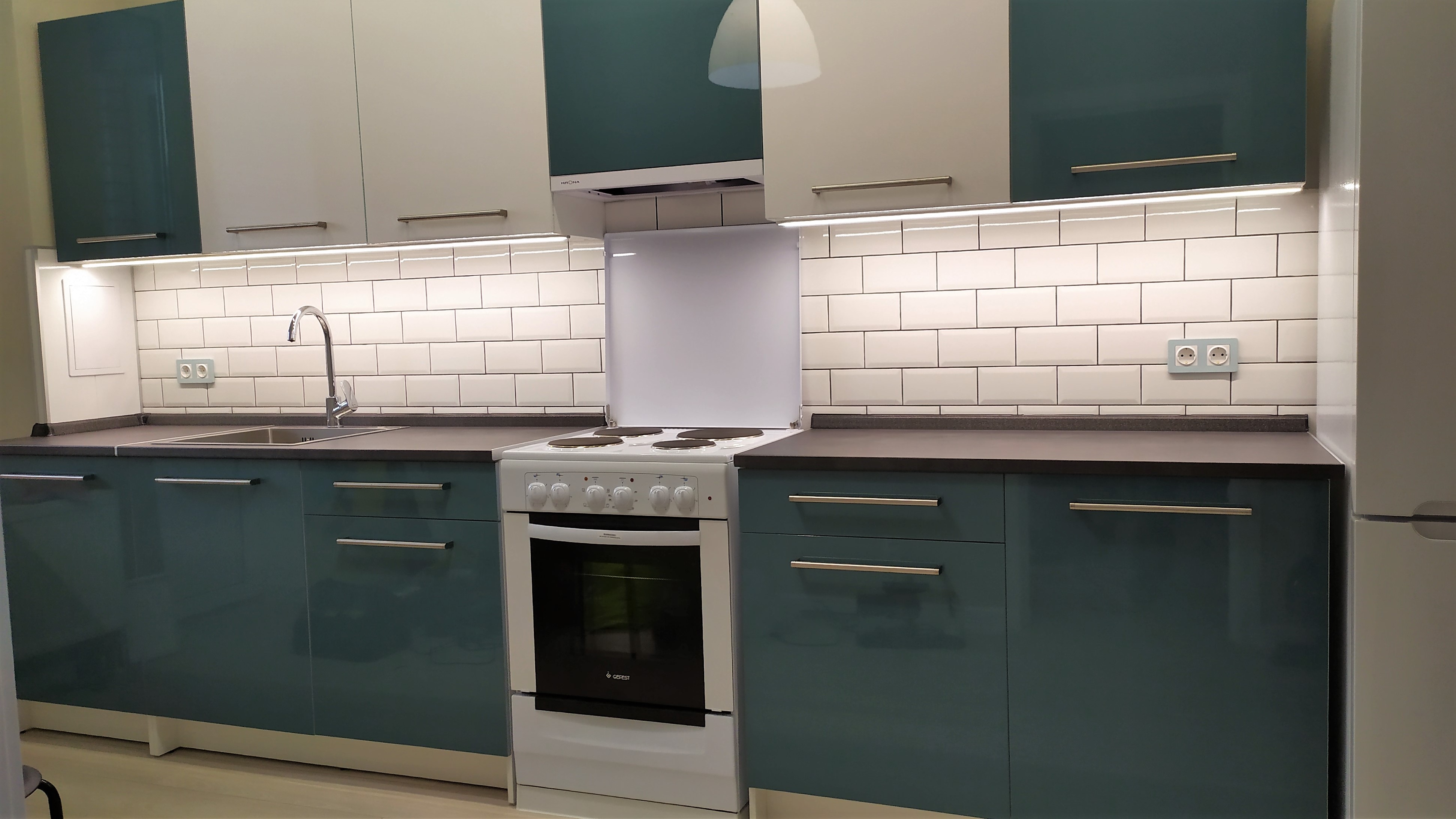 Длина светильника под навесными шкафами - 110 см, значит, потребуется профиль 2 метра (они ведь кратны метру?) и 110 см ленты. Светильник вытяжки - 49 см - профиль 1 метр и 50 см ленты. Итого: 3 метра профиля и 160 см LED-ленты (если продаётся на отрез, если нет, то минимум 2 метра).