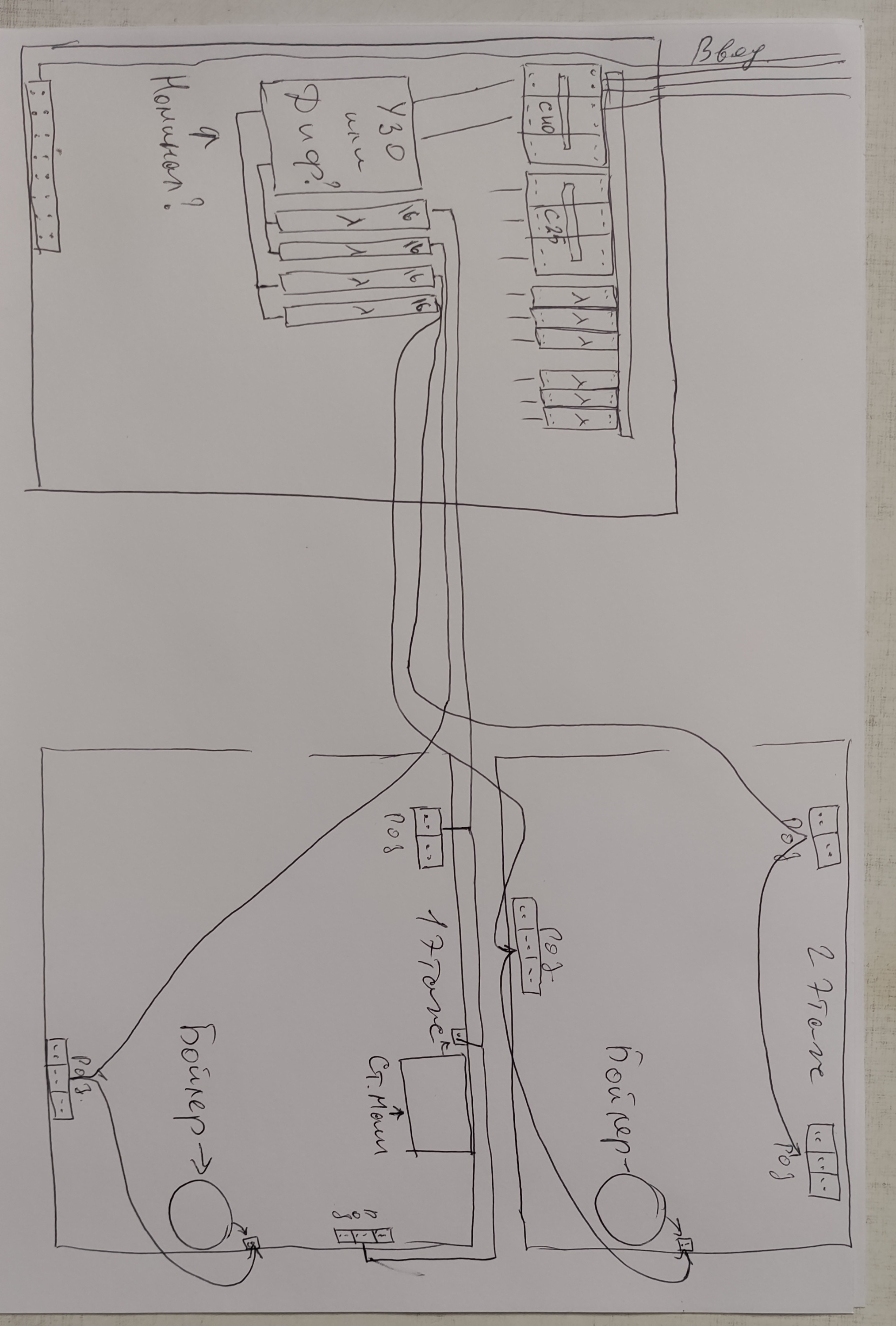 Приветствую всех. Подруга попросила в новом доме сделать электрику. И что то я озадачился рядом вопросов. Будет два сан.узла(один над другим), в каждом будет по бойлеру, в нижнем будет еще стиральная машина, ну и некоторое кол-во розеток. И стоит задача обезопасить пользователей от возможных неприятностей. Отсюда первый вопрос: ставить УЗО или ДИФ? И какой номинал? Сколько полюсов? На рисунке, я схематично нарисовал как хочу подключить. Т.е., розетки пробросить каскадом, но поделить на два автомата. И тут второй вопрос: можно ли так делать, и потянет ли УЗО/ДИФ два санузла? Вопрос третий: могу ли я запитать свет от этих же розеток, или под свет тянуть отдельную линию и свой автомат? В жилых комнатах и коридоре будут еще розетки, но там просто автоматы поставлю. В районе лестницы на второй этаж, предполагается поставить проходные выключатели. Ни разу их не подключал, есть ли какие то особенности, и где посмотреть грамотную схему подключения? На фото, в каком виде щиток сейчас(делал не я), я буду нагружать нижнюю планку. На рисунке схематично обозначил свои мысли.