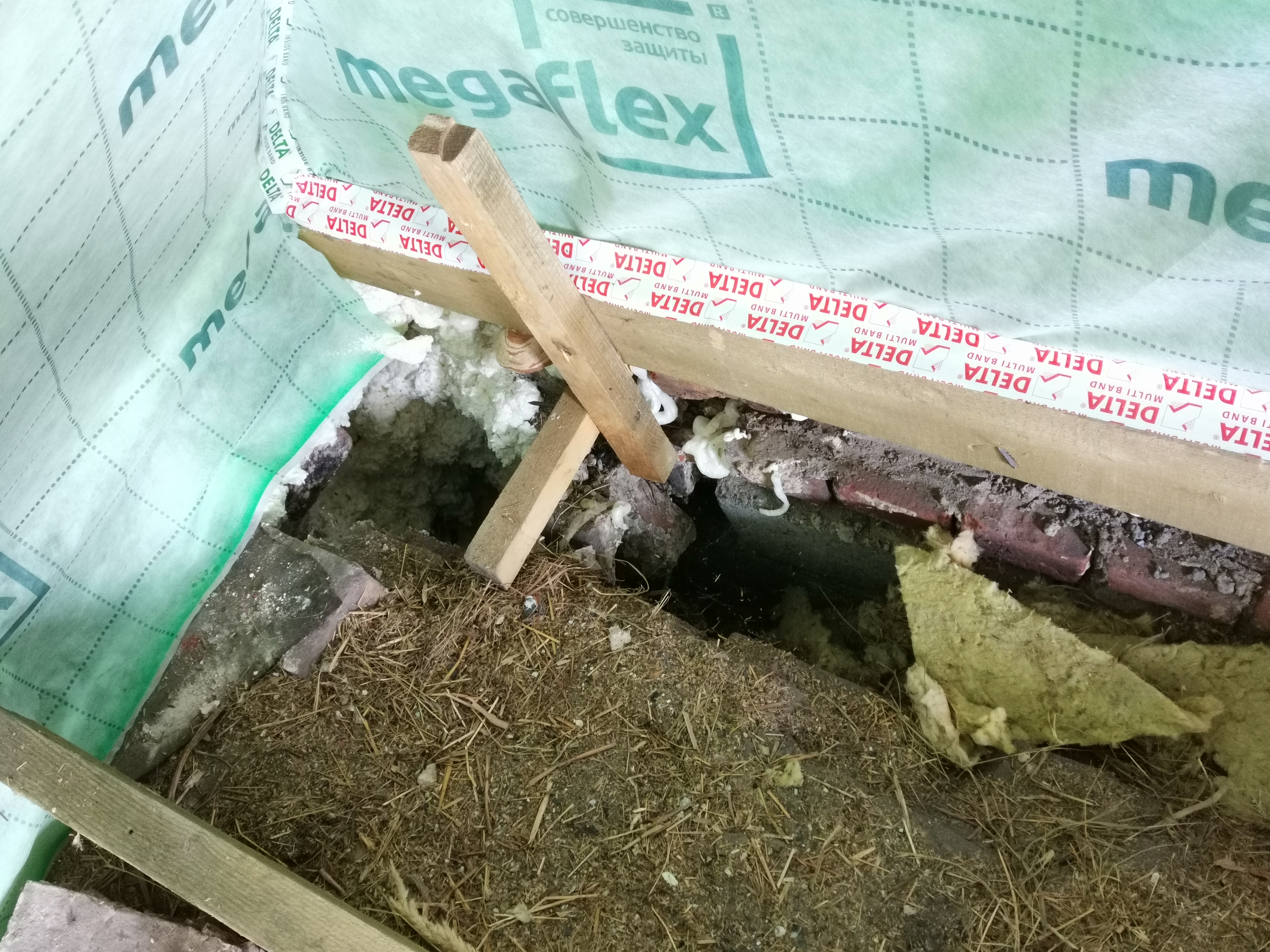 Сделали теплую мансарду. Дом с колодезной кладкой. Очень старый. Ранее пространство в стене (колодец) был заполнено угольной ожигой, но часть высыпалась, часть осела. В итоге в верхней части пустота и эта пустота как раз выходит под пол мансарды.