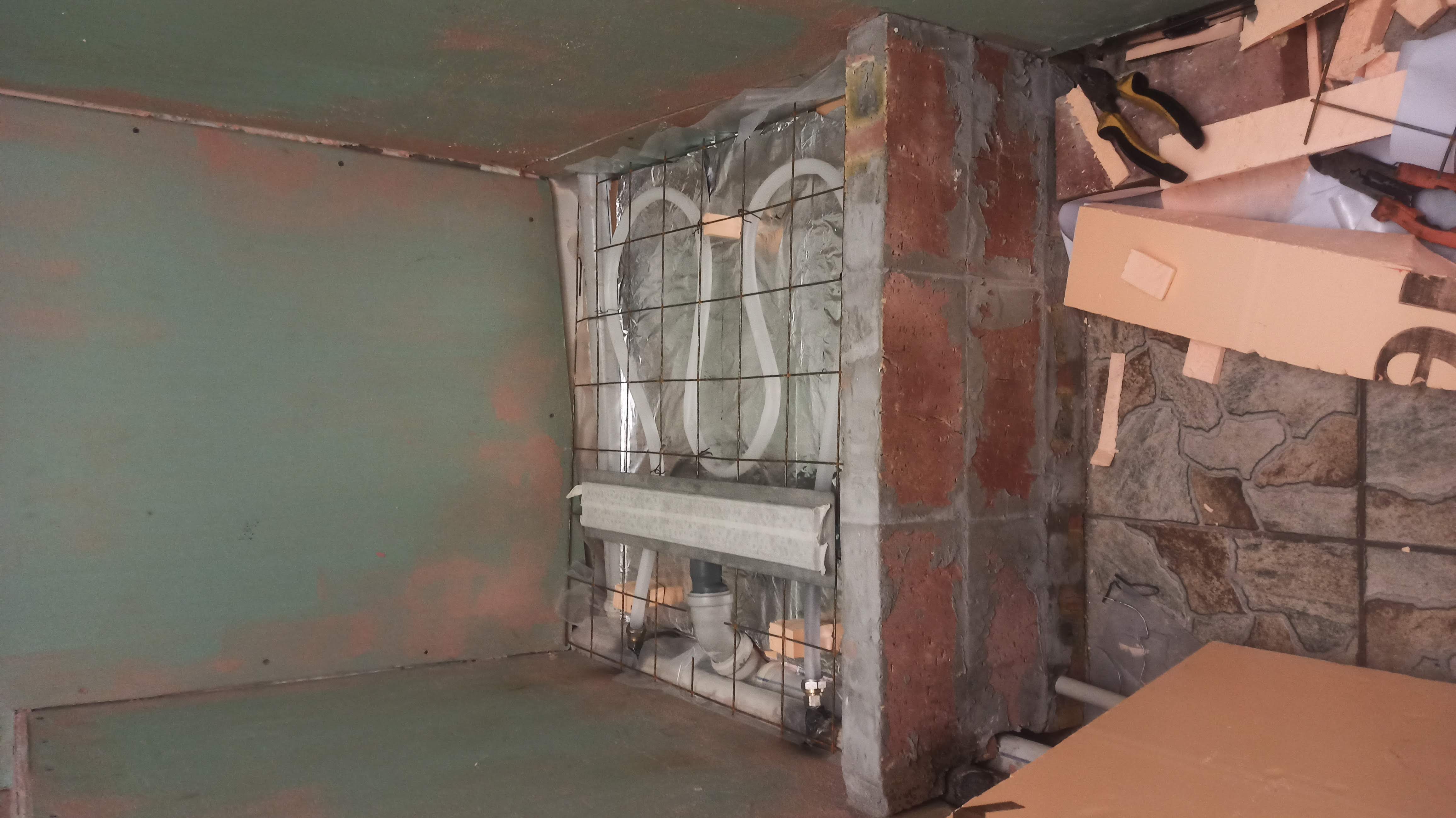 На на двух стенах лист ГКЛ приклеен и прикручен к существующей перегородке ГКЛ. На третьей стене ГКЛ в нижней части так же приклеен клеем титан 60секунд(пенополиуретан) и прикручен к стене, на верхней через профиля с расстоянием для смесителя.