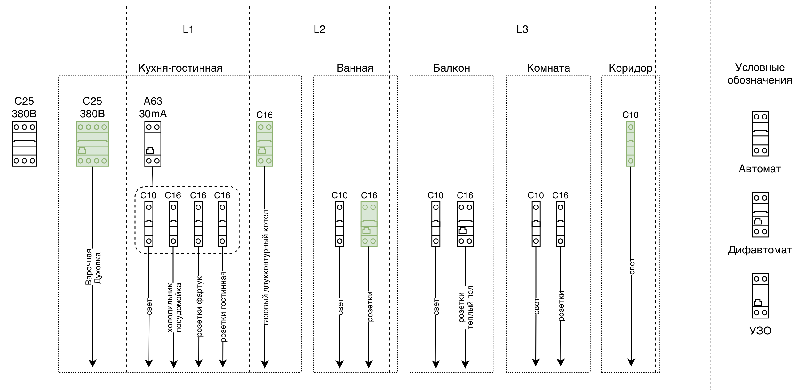 Здесь можно уточнения? Заменить все обычные автоматы С10 на дифы или поставить перед группой C10+C16 УЗО? Я хотел бы пояснить текущую логику, мне нужно уложиться в 24 элемента. Добавление УЗО или замена на дифы -- потребует уменьшения линий. Не говорю, что это не приемлемо, просто поясняю почему так составил схему.