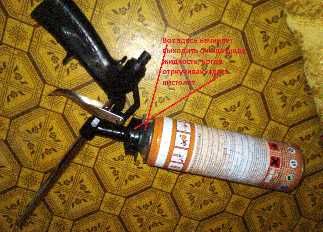 Здравствуйте. Пытаюсь открутить пистолет от баллона очистителя пены, при этом начинается шипение, баллон сильно охлаждается и очищающая жидкость льется наружу через крышку пистолета, где он накручивается. Подскажите как правильно снять или я все правильно делаю?