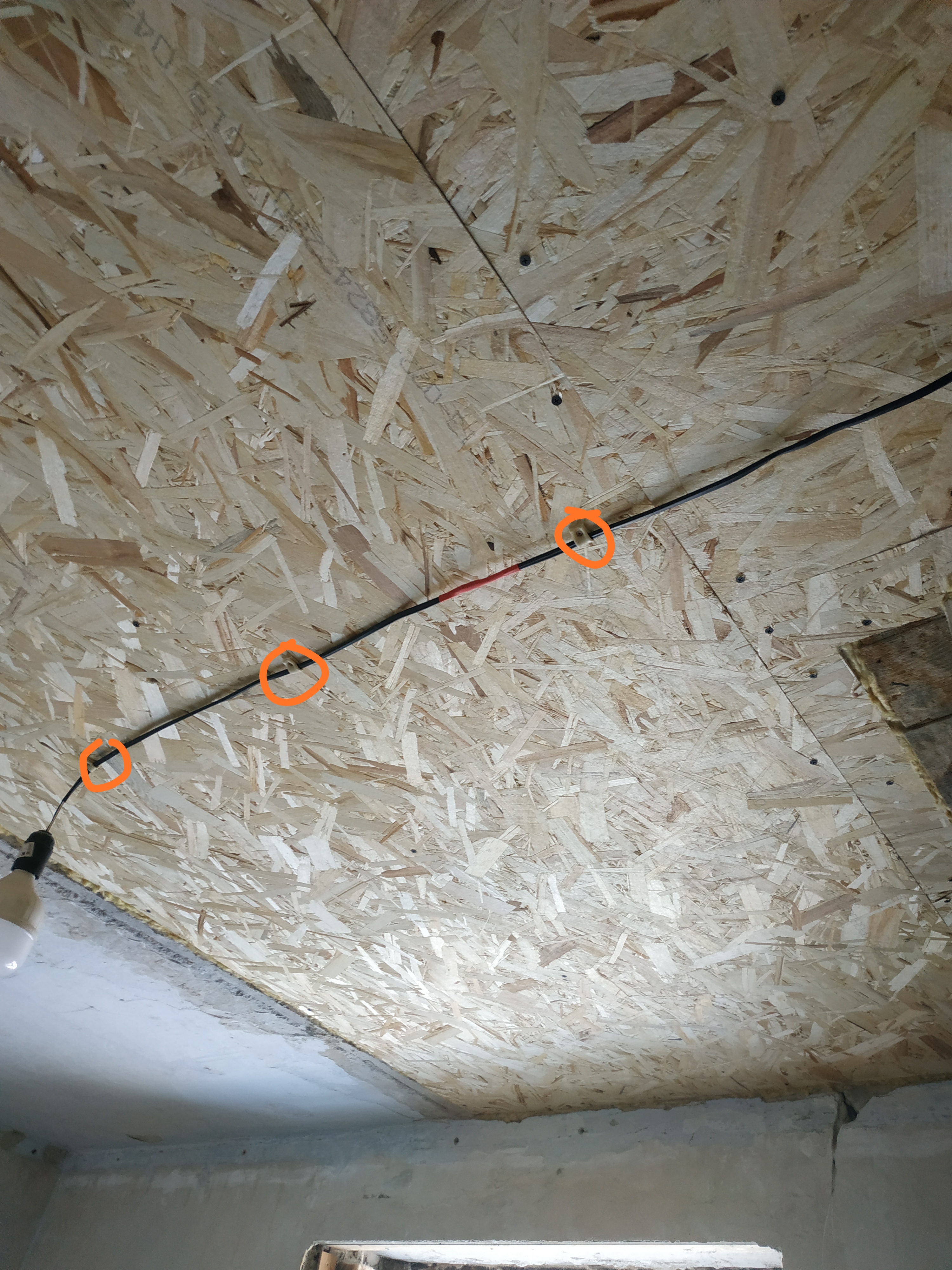 Я смотрю там ОSB ? Под натяжным потолком это считается скрытой проводкой,по горючему основанию, соответственно, должна быть в стальных трубах