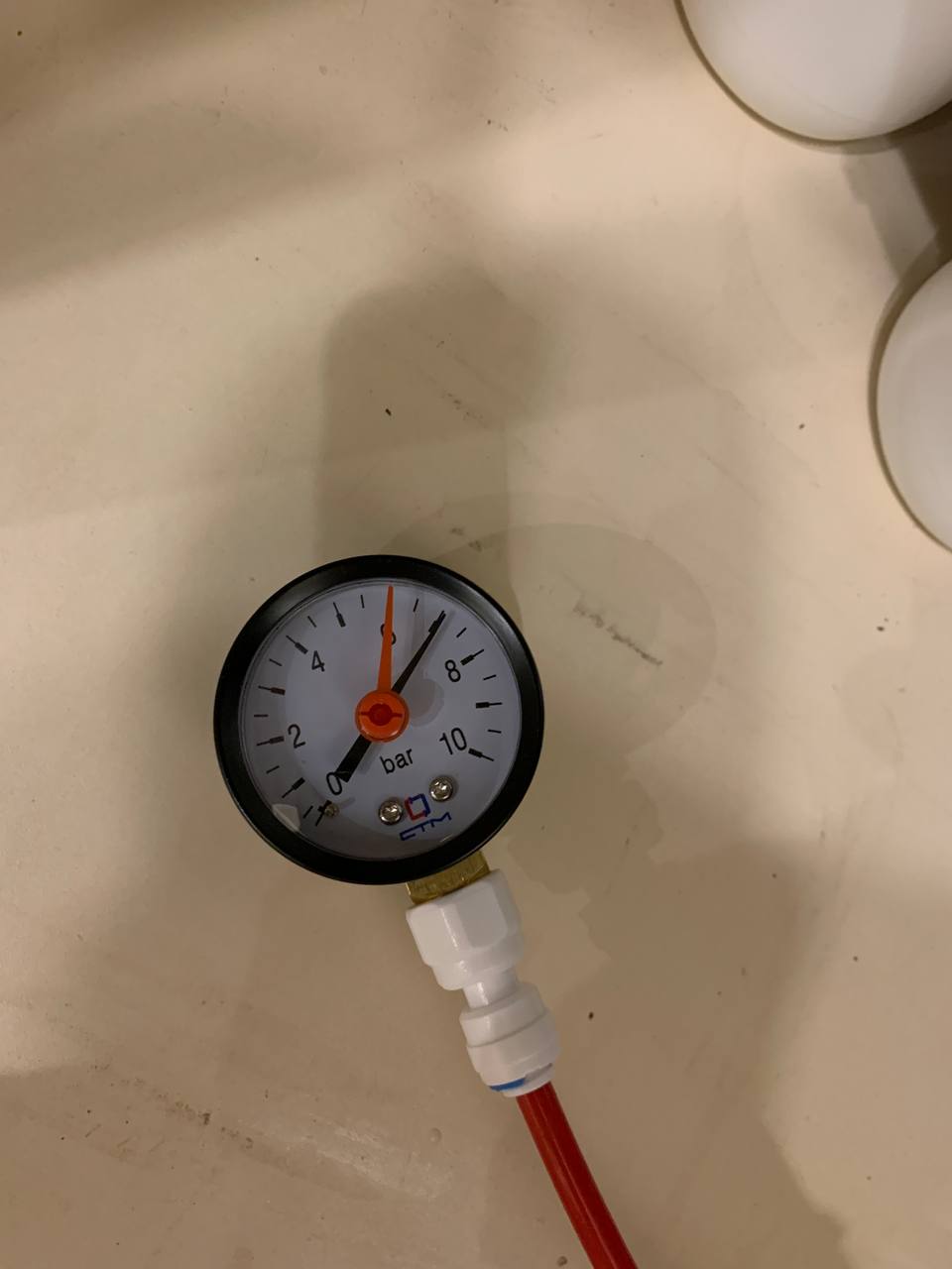 На втором фото соответственно подключен манометр от фильтра (на кухне) уже после всех разводок и редуктора. Показания на манометре редуктора и манометре от фильтра одинаковые.