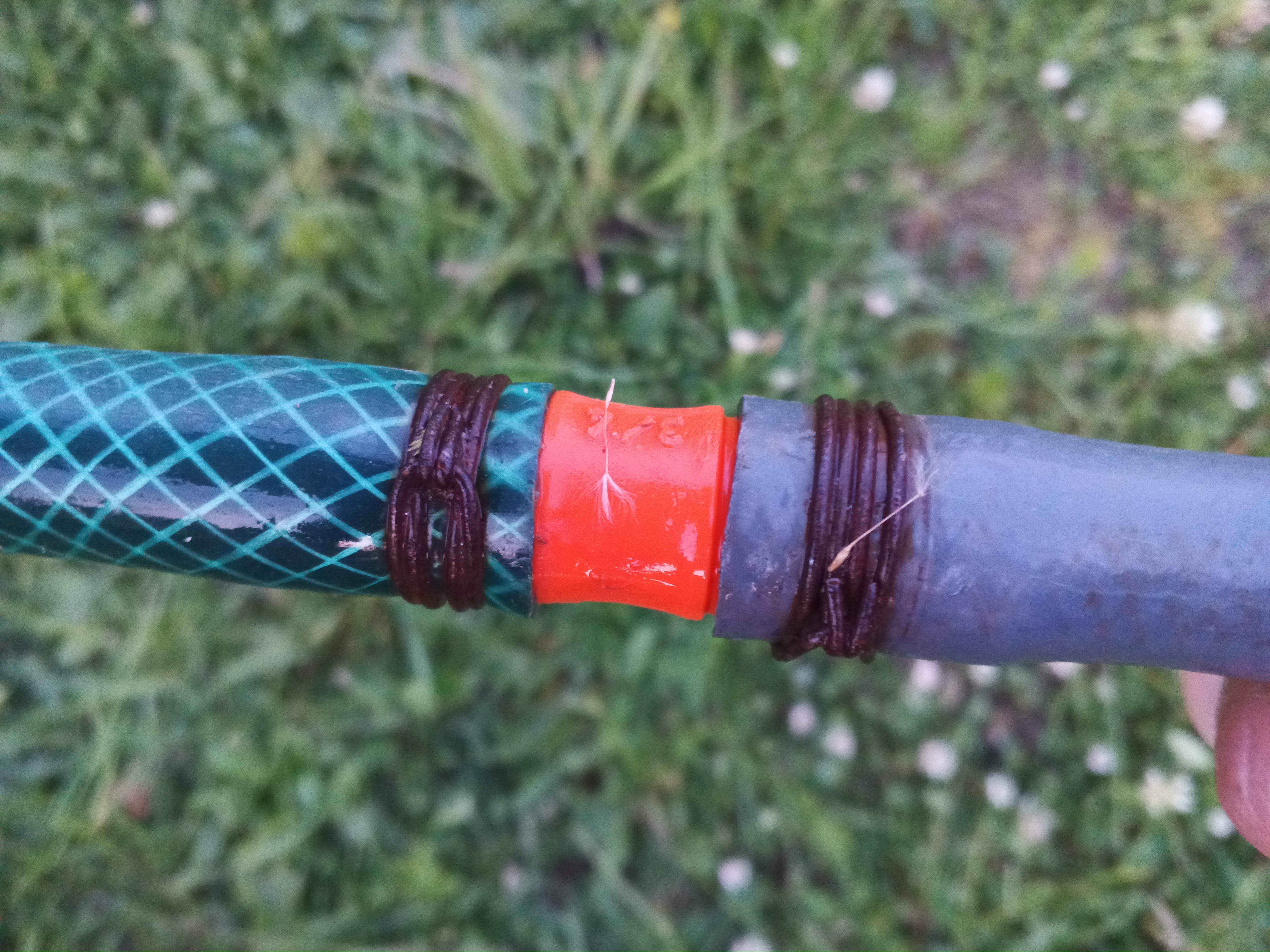 Я ж не просто так это соединение сделал именно таким способом, ну а муфта там была раньше. Нафиг ее... Хуже по двум причинам, по крайней мере для моего использования шланга.