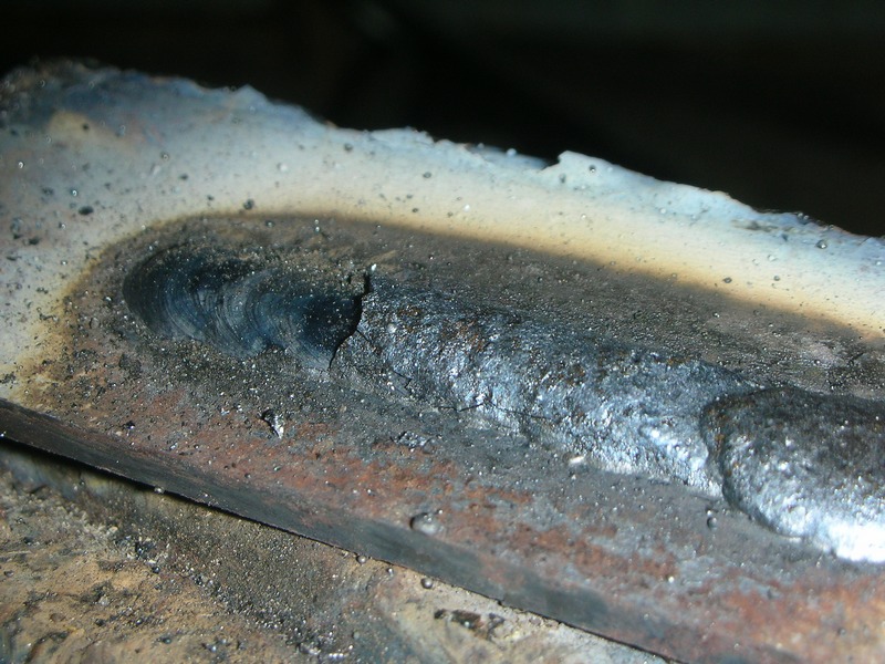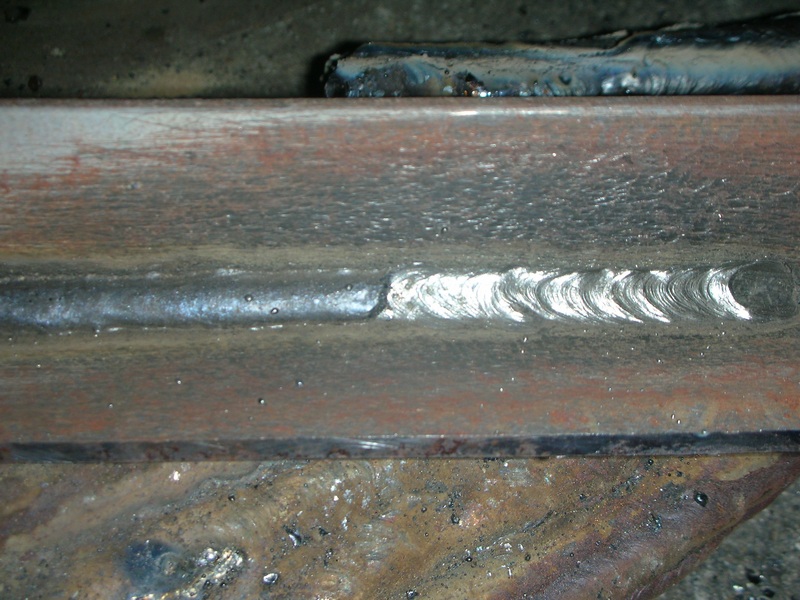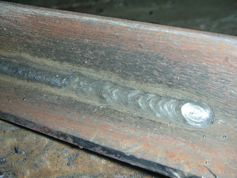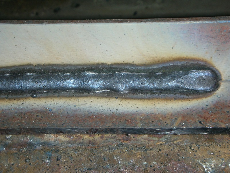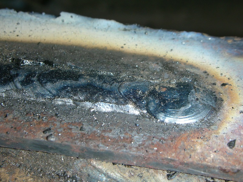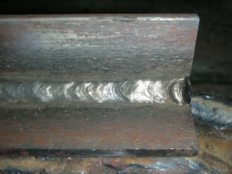 Не помню кто просил. Нафоткал немного углового шва (2 полосы сложены под прямым углом, одна из них лежала горизонтально). Со шлаком и без шлака. Электрод - АНО-36, ток - 90А, ширина полоски - 3 см. Получилось не очень красиво, поскольку когда сильно стараешься, то вот так и получается. На верхней полке местами, кажись, маленькие подрезы получились, поскольку варил на полу и сильно наклонить электрод было несподручно Варил уже початым электродом, поэтому до конца не хватило. На следующей фотке видно, как продолжен и завершен шов . Не знаю, правильно ли, но после того, как доварил до конца, сделал секундную паузу, а потом опять зажег дугу и поставил в конце "ляпочку". Но эту "ляпочку" много наваривать тоже нельзя - нужно знать меру, иначе при остывании большого количества наплавленного шлака и металла из-под низу всплывет булька, лопнет и в итоге получится куриная жопа. Вот еще точно так же кусочек проварил по горизонтальной плоскости и повторным поджигом заварил в конце кратер