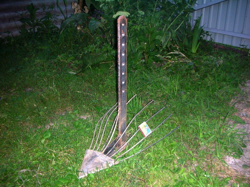 Вот такая копалка у меня есть Она была в комплекте для ручной обработки огорода, поэтому пришлось приварить другую стойку. Сантиметровой толщины полоску не нашел, поэтому сложил вдвое полосу толщиной 5 мм и проварил торцы. Прутья сделаны из очень пружинистой проволоки толщиной 5 мм. Теоретически должны очень хорошо вибрировать, просеивая почву. Но на практике нифига они не вибрируют. Ведь вместо земли, которая с них сзади упала, на них уже лежит следующая порция. И когда в прошлом году копал ею, то крайние прутки приходилось периодически выправлять, а то они сгинались внутрь. Поэтому делаю другую с более широким захватом (на основе культиваторной лапы) и с более длинными прутками толщиной 10 мм. Сегодня пробовал косить ботву бензокосой - хреново. Если бы картошка росла на ровной поверхности, то было бы нормально. А так как она несколько раз окучивалась, то ботва, попадав, обнимает гребни по бокам и в большом количестве находится ниже их уровня. Да еще нож периодически цеплял за вершины гребней и земля летела в лицо. А вот обычной косой получилось поддевать ботву изподнизу и нормально скашивать.