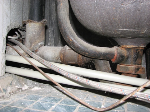 В стояк врезана труба чугунная (слив с ванной), в неё вварен тройник, в которую был всунут коленообразный сгиб (раковина)