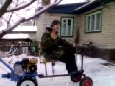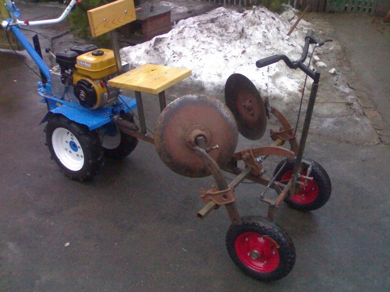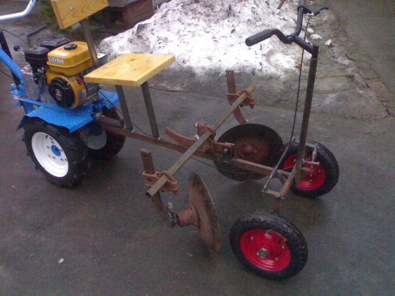 Сделано не плохо, но: стульчик оочень спартанский, да и соскользнуть наверное можно. Колея мотоблока думается будет шире(при работе). Ну про отсутствии регулировки уже говорилось. Как мне думается, диски должны нагребать уже разрыхлённую землю, а у тебя она еще и трамбуется передними колёсами. А что если за ними(передними колёсами) поставить маленькие культиваторные лапки, да и нормального размера тоже наверное пойдут. Где фиксирующая скоба?