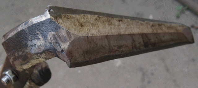 Значит так, в боковой части рабочей лезвии, приготовленной под установку на плоскорез, сделан "П"-образный пропил около 1 см (в зависимости от длины лезвии) в него вставляется нижняя часть фасонной детали плоскореза, затем прихватки, установка на нужный угол и провар. При подобном подходе, не нужна особая квалификация сварщика, не зависит кто, чем , когда и при помощи чего сваривает, сам узел работает на перпендикулярный разрыв. Поэтому подобное крепление оправдывает себя более чем. В дальнейшем в случае необходимости удалить это лезвие, делаются два прореза при помощи УШМ, по сварке вдоль фасонной части в лезвие, (т.е с обоих сторон) а дальний перпендикулярный шов легко выломается, (так как можно приложить усилие на излом) нагрузка.