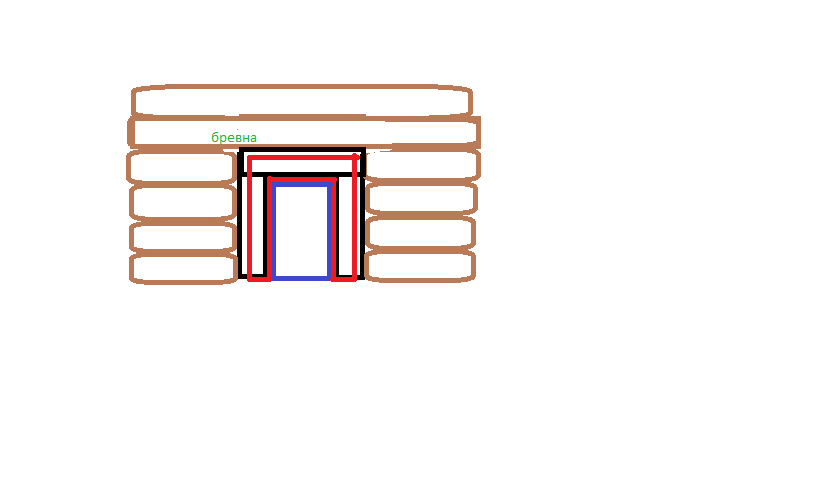 коричневым-бревна, черным- брус жесткий, не привязан к срубу, якобы по нему когда дом садится станет с ним не чего не произайдет, синим- дверь с коробкой, красным наличник. Ставились двери без запенки, тк как дм экологически чистый. Вопрос, двери замерял по черному брусу, ставил тоже по нему, наличник, не точто до бревен не доходит он ж и брус незакрывает, что можно в таком случае сделать? двери "твой дом" наличники- телескоп. с обратной стороны доборы, ситуация аналогичная. диаметр бревен 19 см, толшина бруса 60 на 100, световой проем 780 на 2080..... Что предложить заказчику чтобы закрыть брус?