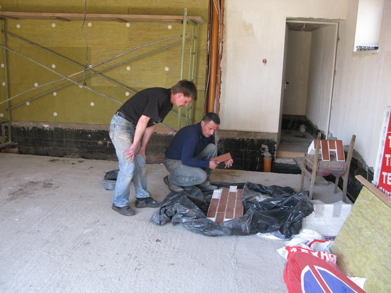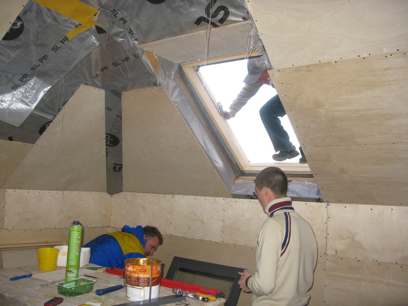 Обшивка фанерой подходит к концу. Продолжили оштукатуривание кирпичных стен мансарды.