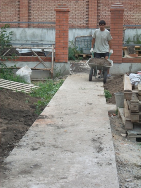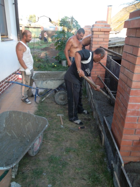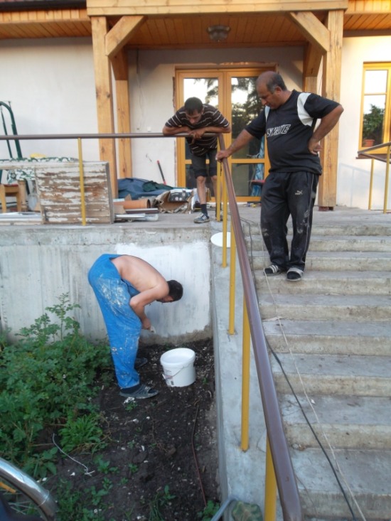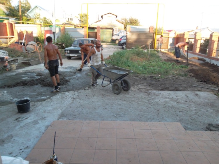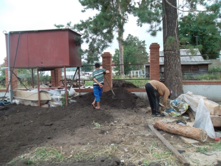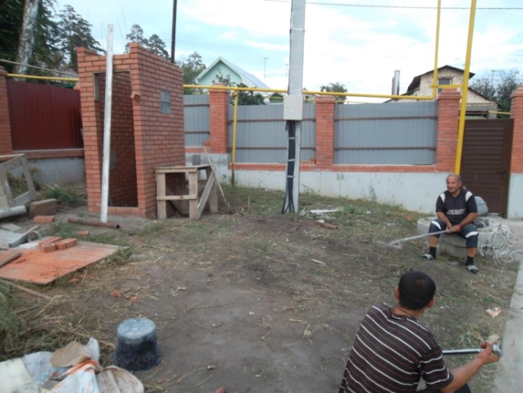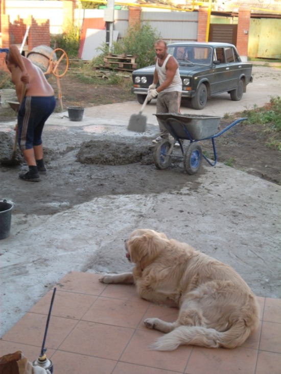 У меня работы в самом разгаре. Тороплюсь закончить "мокрые" работы до дождей и холодов. Вчера на участке работало 14 человек, включая мою жену с сыном тестя и меня как руководителя. Целый день сидел то на одном месте, то на другом,- "руководил", от слов "Водил руками". Армяне занимались входом в погреб на улице и ремонтом подпорной стенки. Таджики (3 чел), и узбеки ( 3 чел) отсыпали землёй участок. Жена с сыном красили направляющие забора и обрабатывали "гидростопом" кладку столбов забора. Тесть помогал руководить и переставлять мне стул. Сын мастера, которого нанял делать декоративную шитукатурку, покрывал стены дома грунтовкой. (Сегодня начали делать штукатурку.)