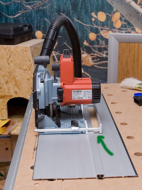 Да это штатный параллельный упор пилы в положении "расширитель платформы". Погрешность там, можно считать, нулевая - пила прижимается к гребню шины краем платформы через металлическую проставку (4,5 мм) и фиксируется прижимающимся с другой стороны этого гребня параллельным упором.