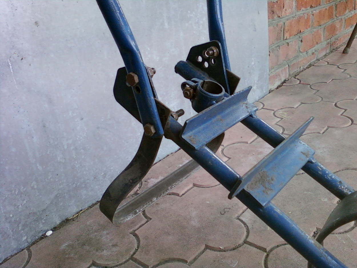 как и обесчал даю фото-нож на пропольнике заточен с двух сторон,отверствия-для регулировки высоты ручек,приваренная и распиленная труба-для маленького окучника