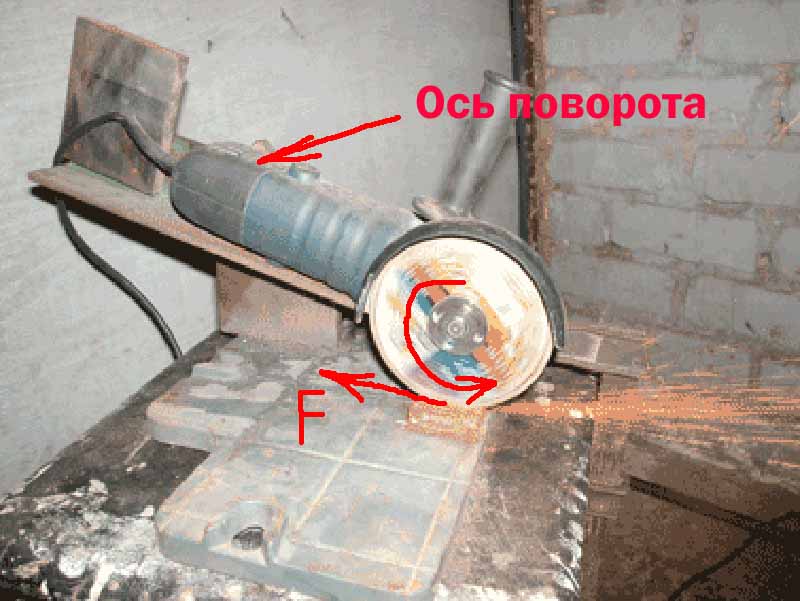 Обратите внимание, в какую сторону летят искры, а точнее на направление вращения диска. Если возникнет желание повторить конструкцию, сделайте также. Если поставить болгарку зеркально(чтобы искры летели на себя), то она будет слишком сильно врезаться в материал, следствие – разорванные диски, убитый редуктор.