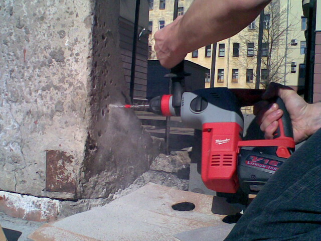по среднему бетону, 3 Дж перфоратором (Milwaukee V18HX), на глубину 50 мм.