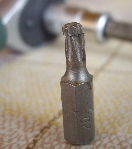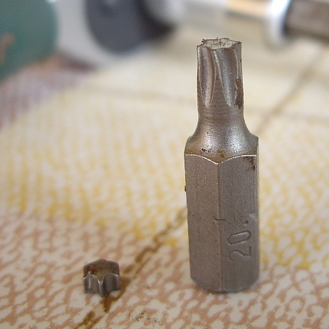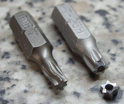Значит так... дело было на даче. Там у меня дырявых бит нет. И Torx25 не было, а в глубине патрона хрен чего увидишь, приходится прикладывать биту и смотреть, сцепилась или нет? Была Torx20, сцепилась хорошо что видно на фотке свёрнутой биты. Это была бита из набора B&D. Приехав домой я пошёл в закрома и подобрал биту более точно, таким образом я пришёл к выводу, что искомый размер - дырявый T25 (кстати, может и T27, у меня такого нет, а T30 уже не лезет...) Таким образом сложила буйну голову дырявая бита T25 Force из спецнабора (там всякие хитрые биты, свастики, трехлучевые кресты и т.п..) Удивившись и решив дополнить статистику применил с чуть меньшим усилием биту из набора Force без дырок, но на T20, T25 не сцепилась! Результат - эффектная спираль в стиле модерн (посвящается Антонио Гауди.) В принципе, удалось её сохранить рабочей, просто свернулась несколько :) Нажал бы посильнее - оторвал на фиг. Зачем они на Боше так контрвинт засадили?!