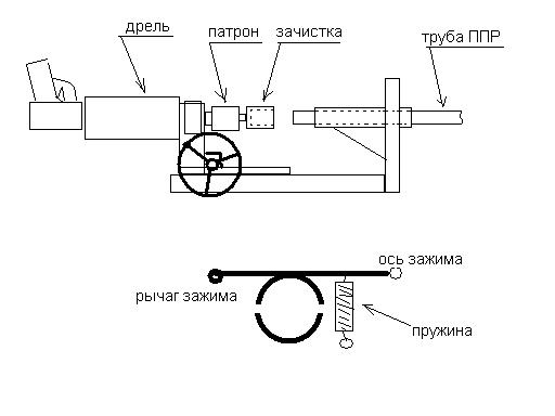 Видел в каком-то магазине бытовые сверлильные станки с хомутом крепления для дрели - вместо двигателя. ИМХО если положить данный станок набок и модифицировать его рабочий стол - установить спец.зажим (в виде подпружиненной разрезной 20см. трубы с резиновой подложкой - см. рисунок) в котором можно фиксировать трубу ППР, то ИМХО можно будет достаточно быстро и легко зачищать большое кол-во армированных труб. Еще можно нанести риски на рабочем столе такого станка - для центрирования разных диаметров труб. А если в центре зачистки поместить граненый металлический конус (с гранями чуть более внутреннего диаметра трубы ППР) то будет автоматом сниматься еще и фаска.