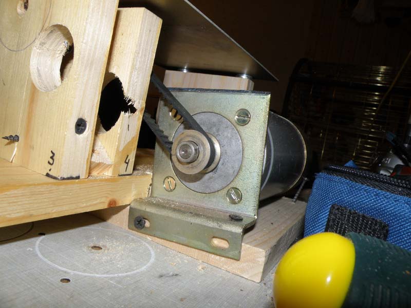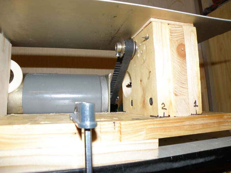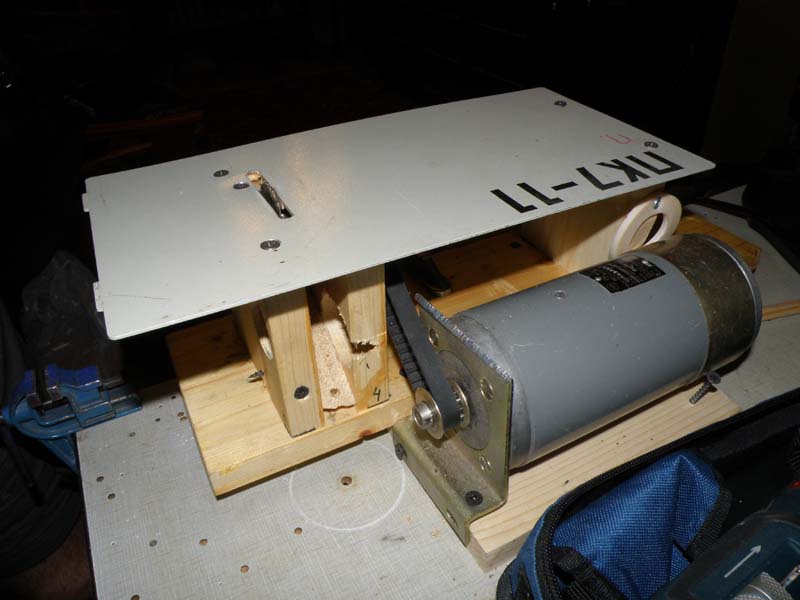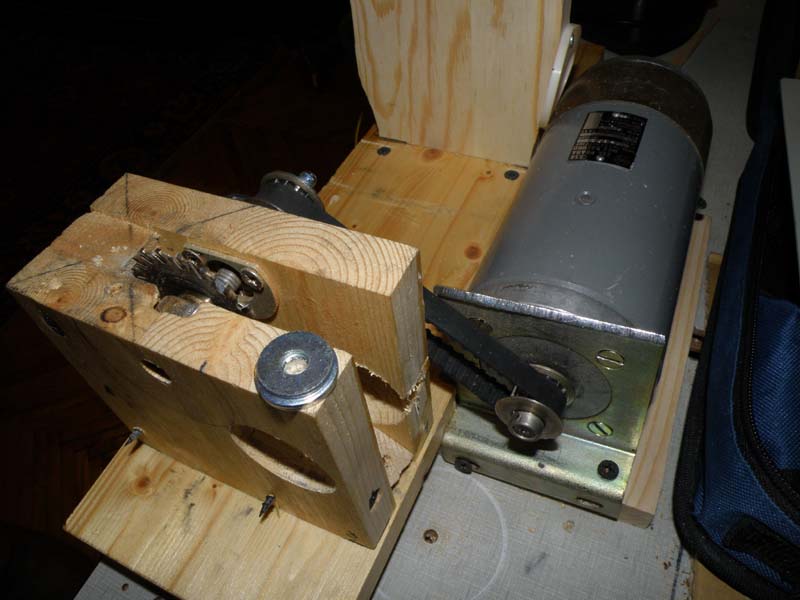 Тема неожиданно вызвала интерес у одного из читателей - поэтому я вспомнил о существовании этой темы :) Уже довольно давно была изготовлена третья версия, скорее похожая на окончательную. Можно только заменить хлипкую сосну на что-то более прочное. Итак, спецификации: Ремень короткий, зубчатый из старой советской техники, предположительно компьютерной. Мотор 24В, 2000 Об/мин, черт знает сколько ватт, но при хорошем питании пилит все что дают. Шкивы - зубчатые, металлические, были в комплекте с мотором. Моторов было два - с одного шкив снят и пересажен на вал пилы. Фиксация на валу - штифт сквозной. Источник питания в версии 3.0 - два Li-ION аккума от шуруповерта Bosch GWI последовательно 10.8В х 2 = 21,6В и дофига ампер. Источник питания в версии 3.1 - монстрический трансформатор размером с два кирпича и весом с четыре кирпича же и выпрямительный мост на 15А. Трансформатор от рабочего места монтажника, кто знает - для паяльников. Куча обмоток. Намотан проводом эдак 1,5 мм в диаметре - можно выбирать много напряжений. Обмотками набрано 24В - номинал. Сглаживающих конденсаторов нет т.к. и смысла в них нет :).