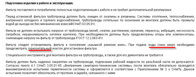 Шлам там скапливается в другой камере если смотреть по направлению движения стрелки, но маааленькие доработки вполне решают данную проблему (магнит, +сеточку доработать). Здесь сама задача ловить грязь используя сетку данного фильтра, и возможность прочистки через ревизию, а если бы я выполнил монтаж как говорит стрелка вверх ривизией при вертикалном расположении и учитывая что подача воды снизу, было бы намного хуже (шлам в трубе скапливался бы). P.S здесь я расматриваю вертикальную установку, зная эти особенности я использовал данную схему.