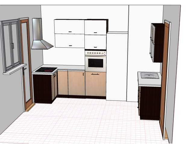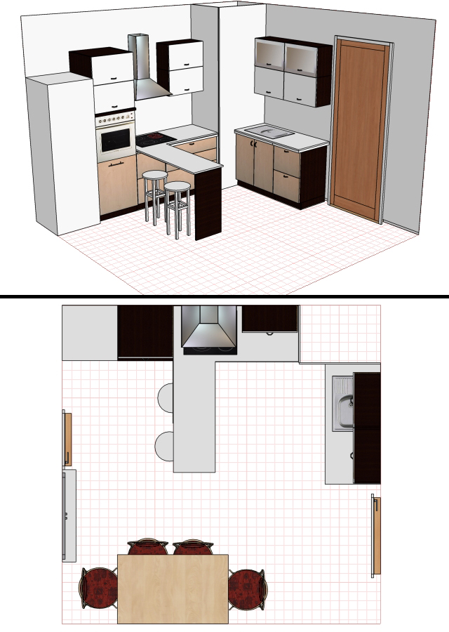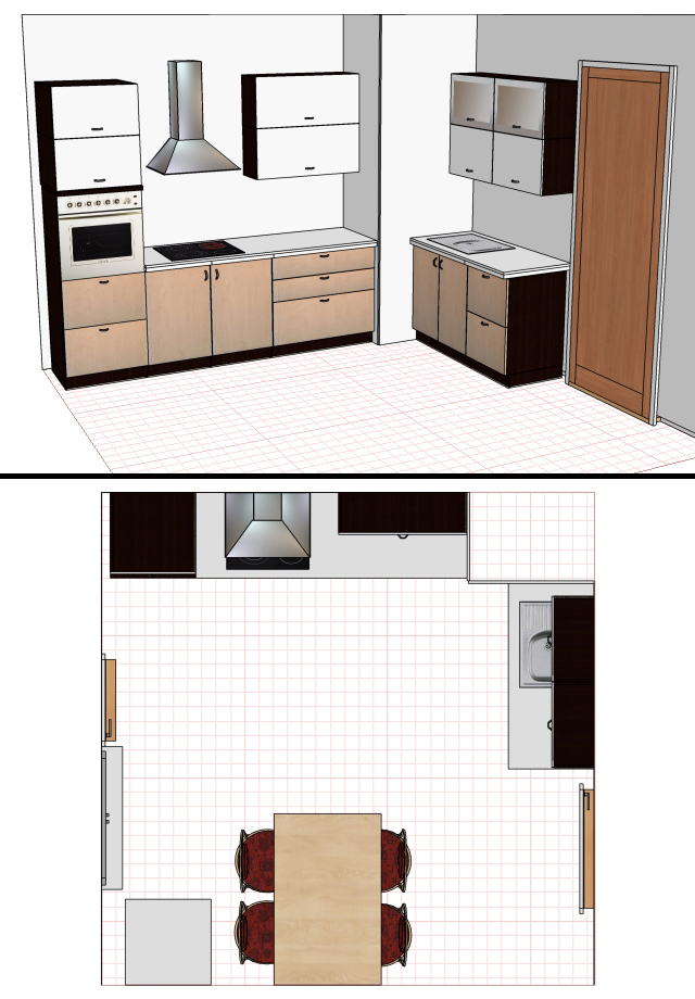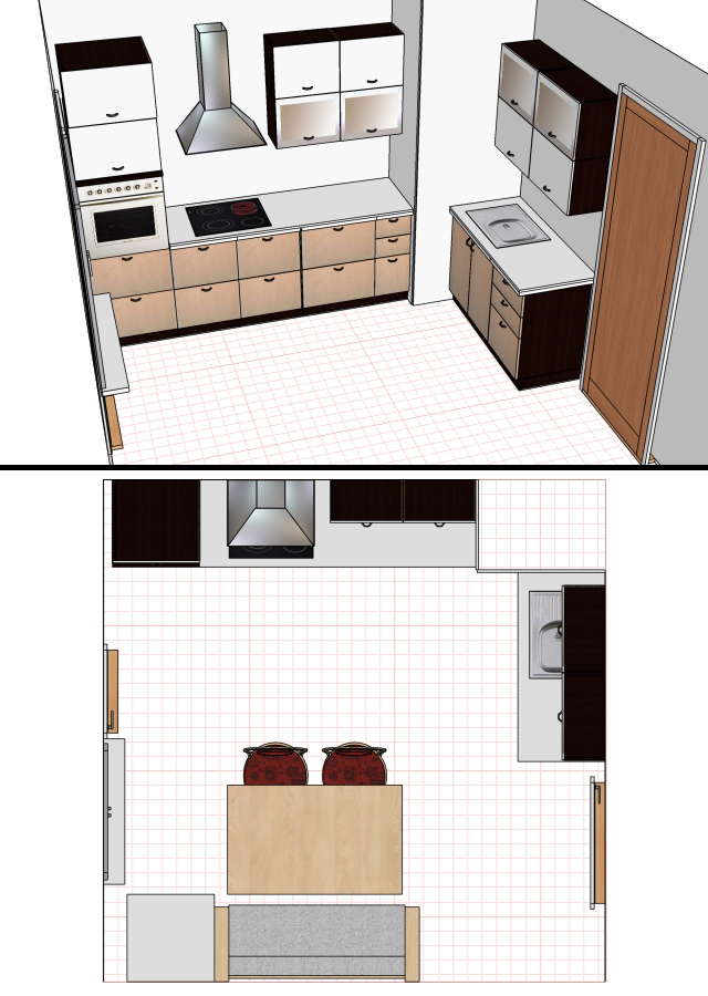 Вот мои 3 варианта. Первый отличается от второго только тем, что первый собран из стандартных фасадов, максимальная ширина которых 60 см, а второй рассчитан на нестандартные. Третий вариант создан в угоду большому желанию убрать холодильник от правой стены и поставить его в один ряд с кухонной мебелью, но из-за катастрофического уменьшения рабочих поверхностей появилась идея добавить что-то вроде барной стойки. Компановка нижних фасадов пока приблизительная. Где будут выдвижные, где распашные, пока не решала окончательно. Понятно, что хочется максимально выдвижных. Расположение мойки меняться не будет. Была мысль перенести ее, но после долгого обсуждения от нее отказались. Возле мойки хочу сушку в нижней базе.
