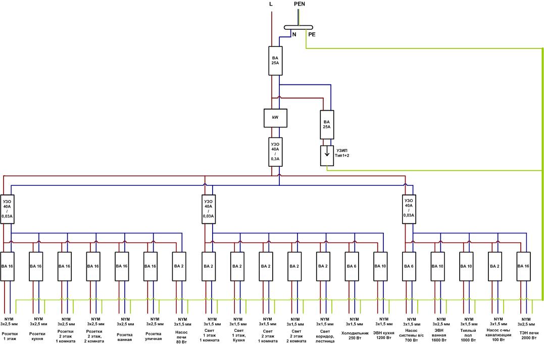 VadimVB написал : Я у себя на даче сделал несколько по другому. От ВРУ на стене дома в дом идёт пятипроводка в щит на первом этаже и там автоматы общии для первого второго и цоколного этажа и групповые первого и от этого щита стояк вниз в цоколь и вверх на второй этаж. На втром этаже маленьки щит с групповыми на освещение и розетки (две комнаты + наружная лампа освещения участка + хол ), в цоколе достаточно внушительный щит - там же гараж, бойлеры, тёплые полы, электрокотёл, душевая, и одна жилая комната.