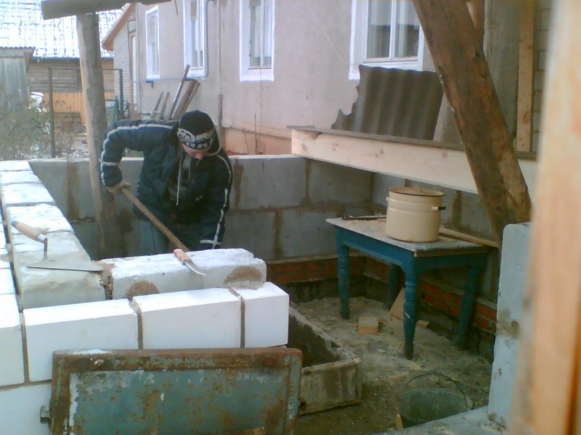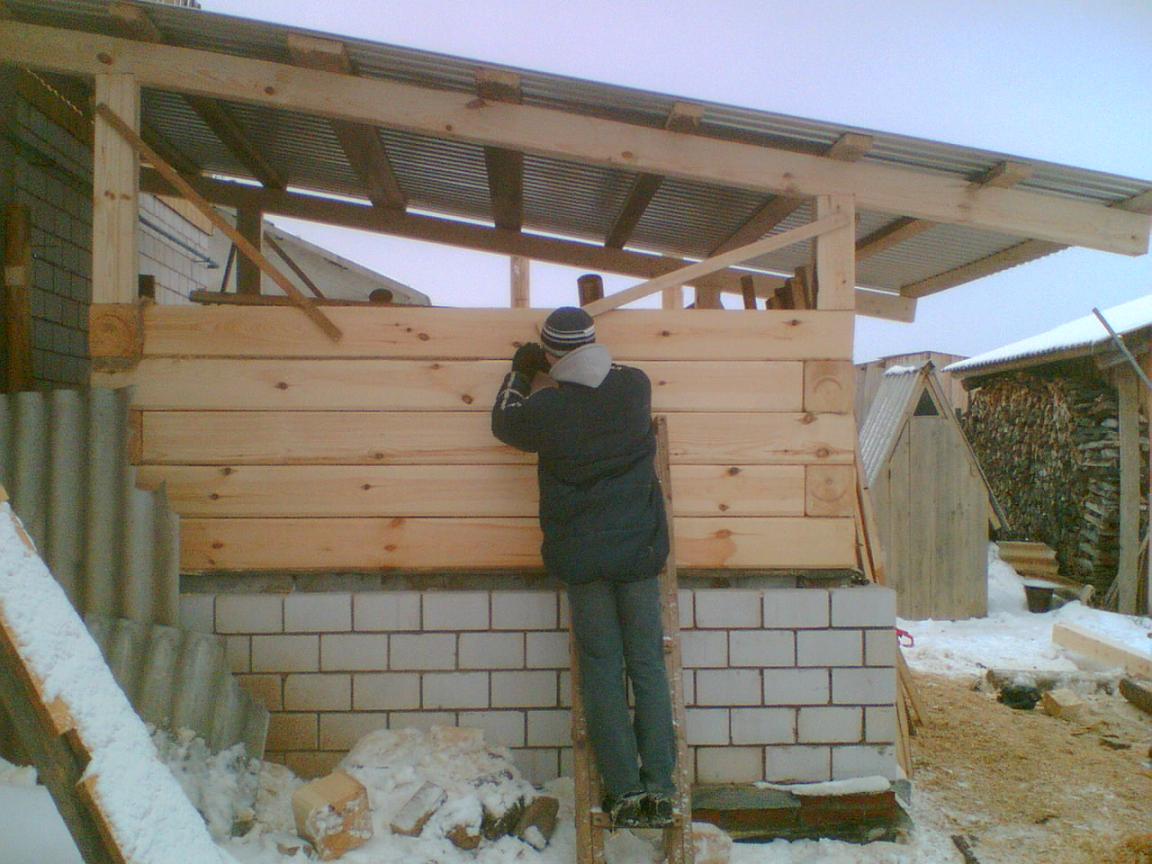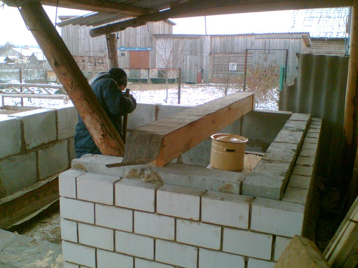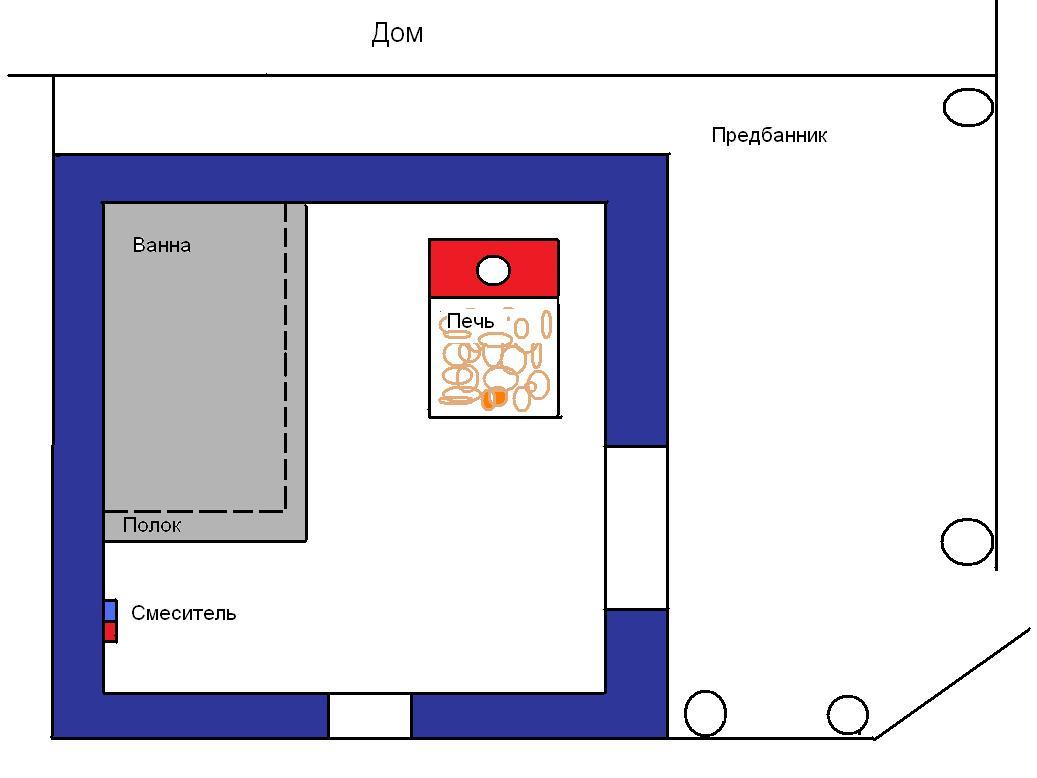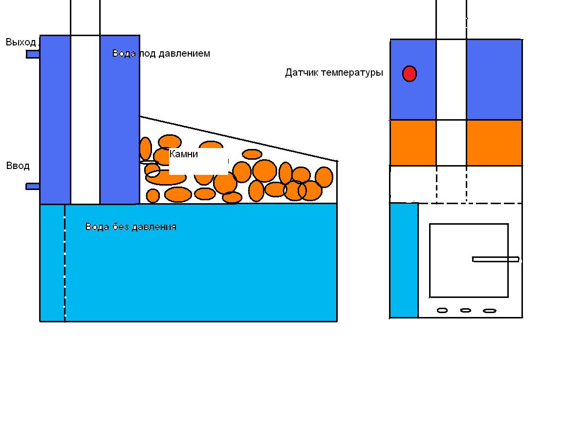На самом деле баня наполовину из бруса, половина из пеноблока. Пеноблоком поднял до окошка, так как гниет баня обычно снизу, первые венцы, и у полка. Кроме того хочу провести в баню водопровод, ибо лень бегать с ведрами. Поэтому баня приближена к дому. Фундамент 40х40 см залит летом, кладка тоже выложена летом. Брус приобрел по осени, 6 метровки 20х20см, с двух сторон строганул электрорубанком, снял фаски и почикал пополам, сложил рядом с фундаментом. Баню ставил на месте летней постройки, от которой оставлял крышу на столбах, их видно на фотографиях, сейчас часть убрал, пару столбов еще осталось. Предбанник скошенный, так как хотелось оставить место для проезда на мотоблоке с прицепом. Под полком планирую поставить чугунную ванну длиной 150 см, для хранения запаса воды летом, и принятия ароматических ванн :D. И вопрос уважаемым форумчанам по поводу печки. На трубу хочу установить типа титана с подводкой воды с водопровода. Давление воды : 1-1,5 атмосферы. Эскиз печки на последней картинке. Печь планирую варить из металла толщиной 6 мм. На что нужно обратить внимание при изготовлении такой печки? Интересуют инженерные расчеты или опыт экплуатации печей под давлением.