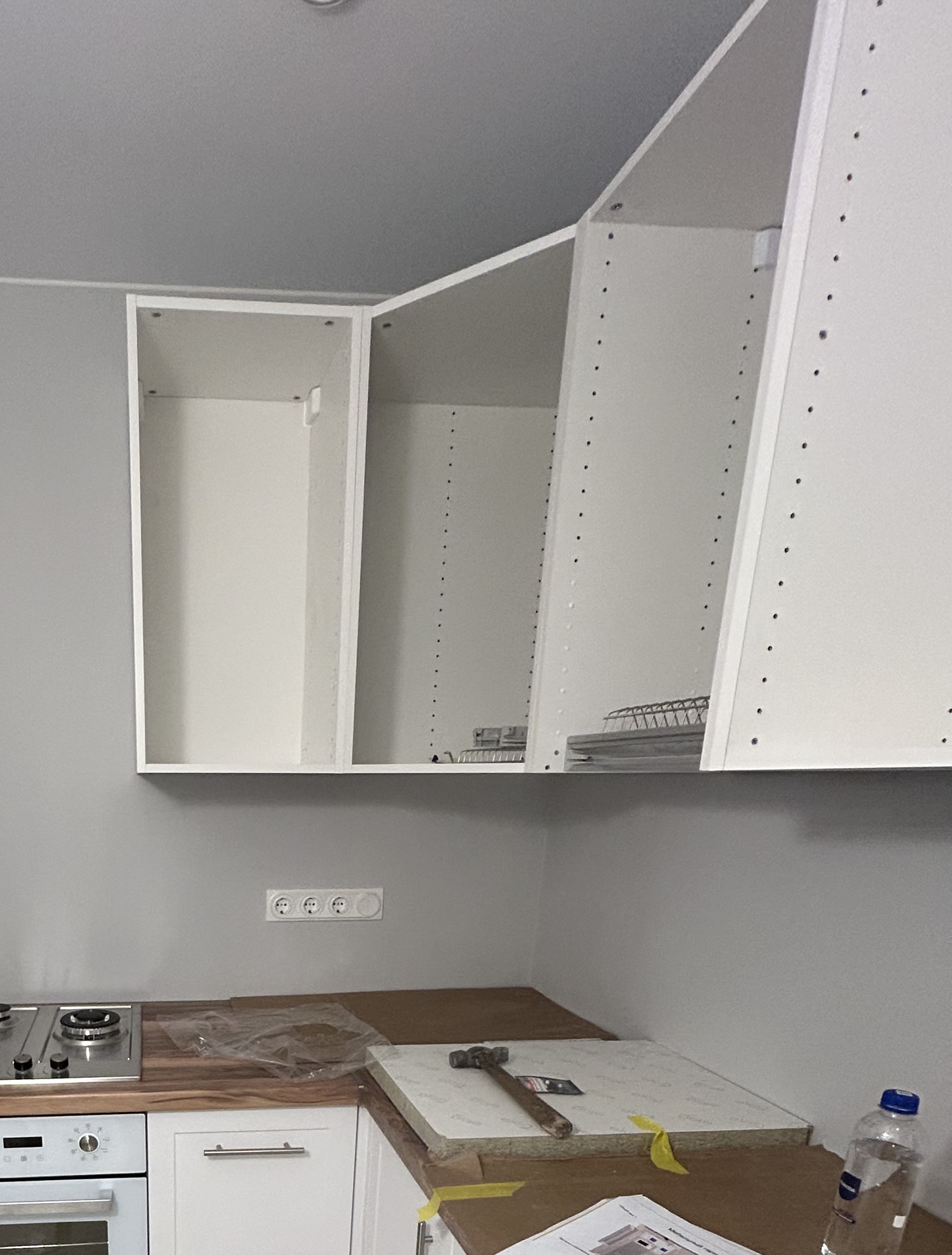 Здравствуйте! Модульная кухня от Лемана про.Угловая.Сборщик вывесил верхние модули на подвесы и отдельные шины, которые шли в комплекте со шкафами Del...