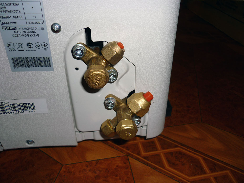 Собрался ставить наружный блок (новый), открутил заглушки штуцеров (на фото, красненькие) а под ними масло. А под большим штуцером, похоже, ещё и пузы...