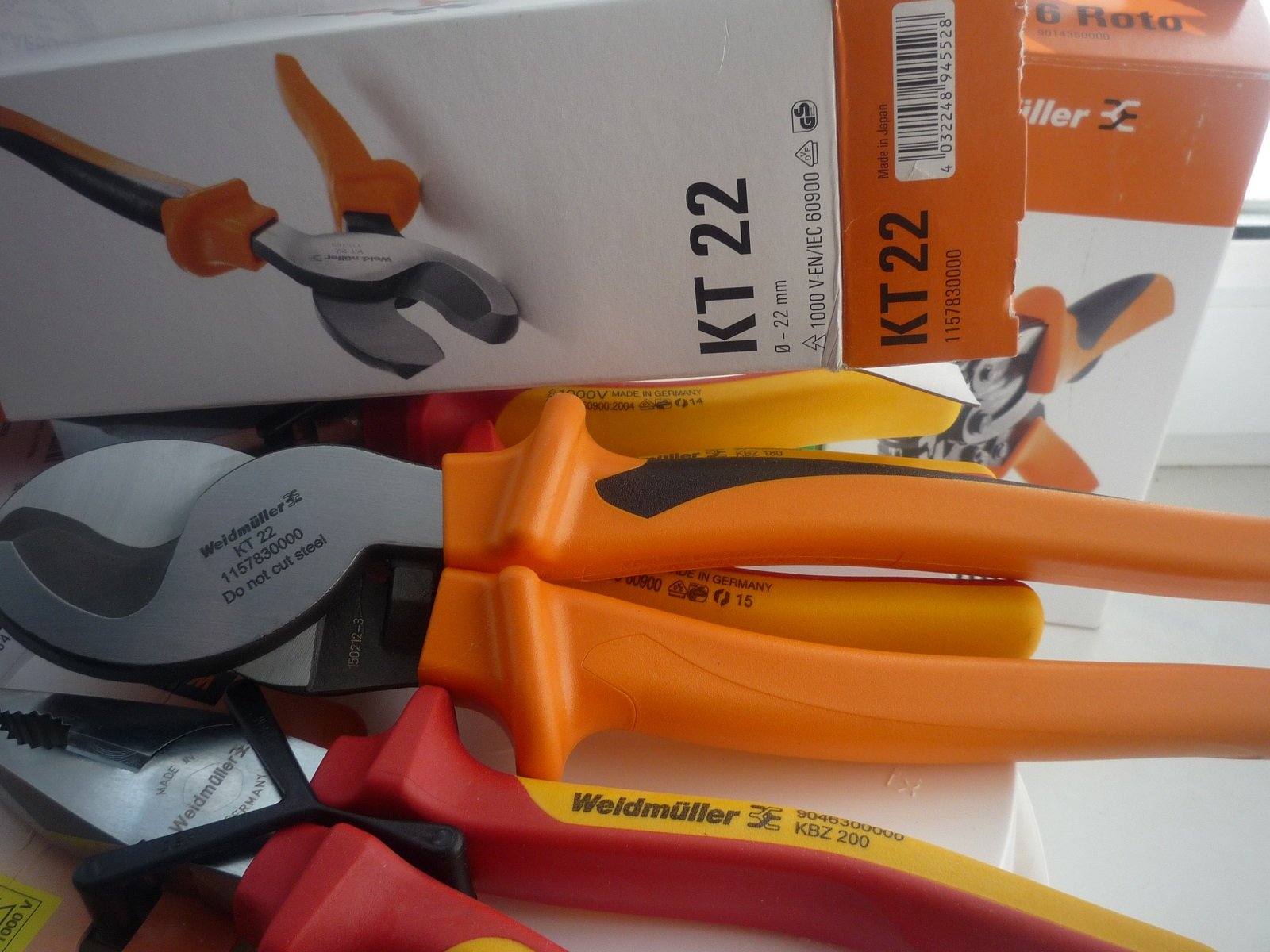 Кабелерез KT 22 Weidmuller для резки медного и алюминиевого кабеля диаметром до 22 мм. 2200 р. shop220.ru/product147181.htm Пассатижи WEIDMULLER (кроме KBZI 200) имеют своеобразную форму,позволяющую делать параллельный зажим - это видно при нажатии на картинку инструмента здесь sibirelectra.ru/price/Tools/Pliers/KBZ_160 Пассатижи длиной 160 мм, изоляция согласно VDE KBZ 160 (9046280000) WEIDMULLER,цена 2100 р. Пассатижи длиной 180 мм, изоляция согласно VDE KBZ 180 (9046290000) WEIDMULLER,цена 2300 р. Пассатижи длиной 200 мм, изоляция согласно VDE KBZ 200 (9046300000) WEIDMULLER,цена 2500 р. Пассатижи для областей применения с повышенными требованиями, изоляция согласно VDE KBZI 200 (9046430000) WEIDMULLER,цена 2900 р. Made in Germany . Цена вместе с пересылом. :swoon