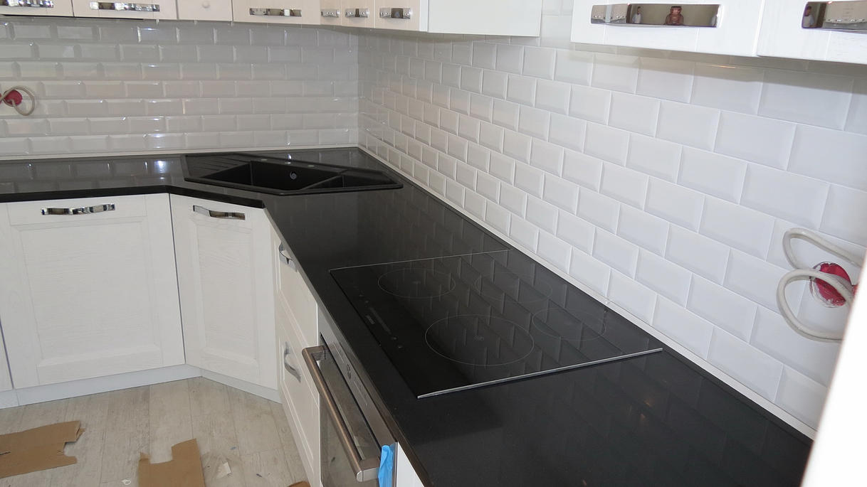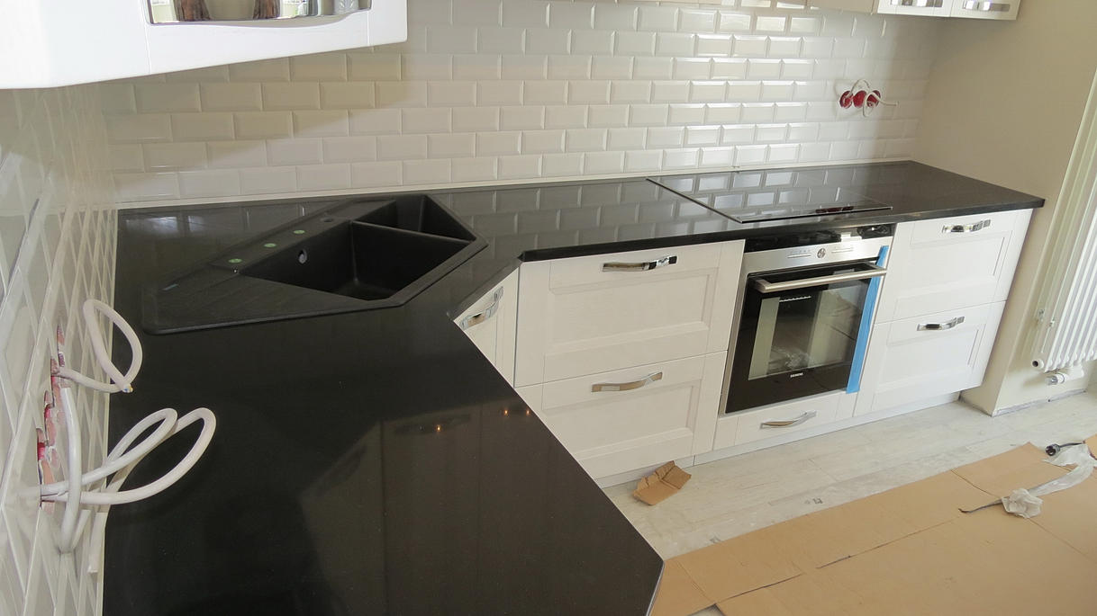 Кухонная столешница из кварцевого агломерата Гоби Блек от компании Техностоне (Чехия). Толщина столешницы 30мм. Состоит из 2-х частей, стык по центру накладной мойки. Плинтус выполнен из белого кварцевого агломерата.