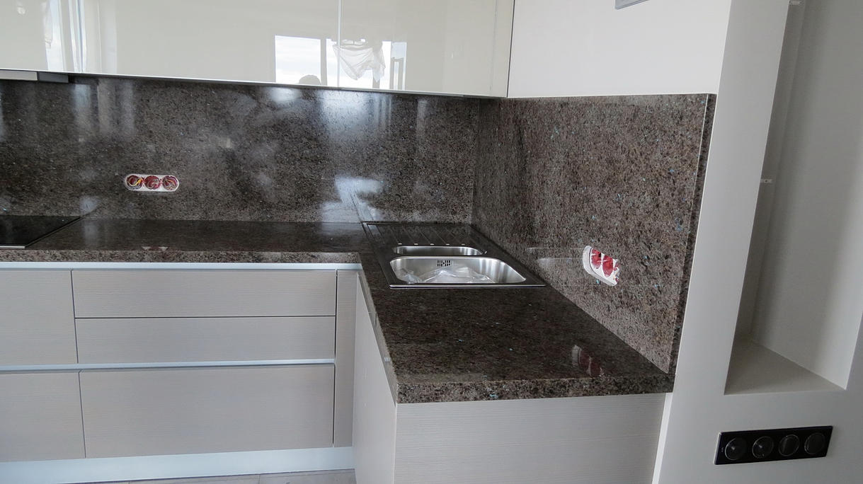 Столешница с фартуком из гранита Лабрадор Антик. Толщина гранита 20мм. Толщина выполнена с подклейкой, высота подклейки 40мм. Размер столешницы 2.7м х 1.7м. Состоит из 2-х частей, стык в углу возле мойки. Мойка накладная.