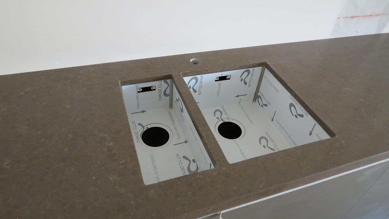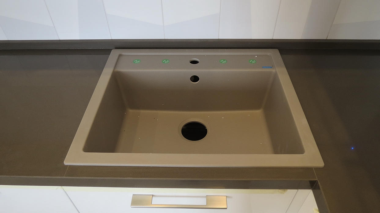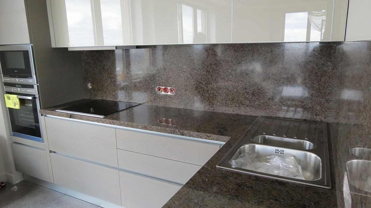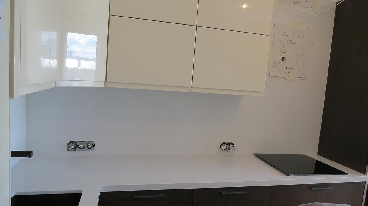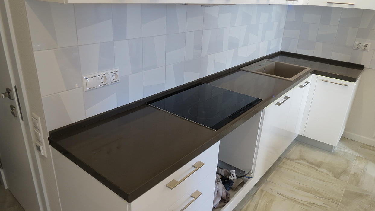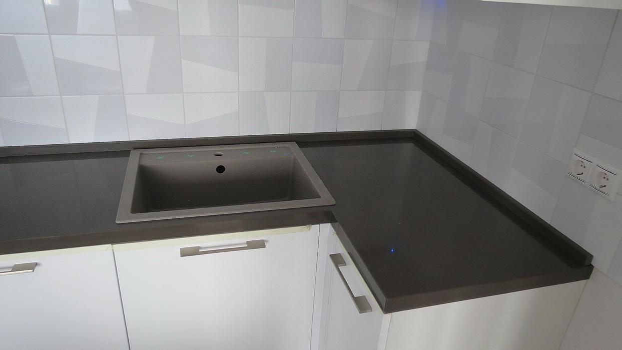 Столешница из кварцевого агломерата RU613 от компании Ханстоне. Толщина материала 30мм. Сложность заключалась в необходимости установить столешницу между 2-мя лакированными боковыми панелями. Чтобы не испортить панели, пришлось делать столешницу из 2-х частей.
